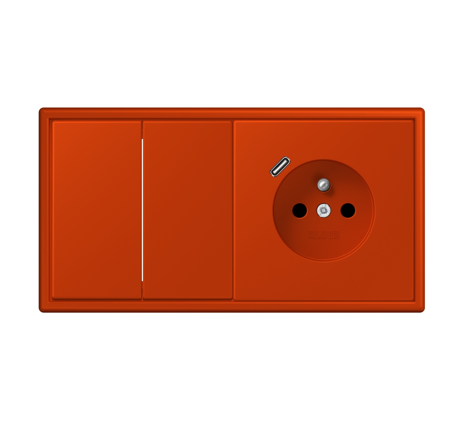Interrupteur et Prise, LS 990, Double horizontal, Le Corbusier Rouge vermillon 59 4320A, Va-et-vient ou poussoir x2, Prise-2P+T x1, Prise-USB C x1, L15,2cm, H8,1cm - Jung