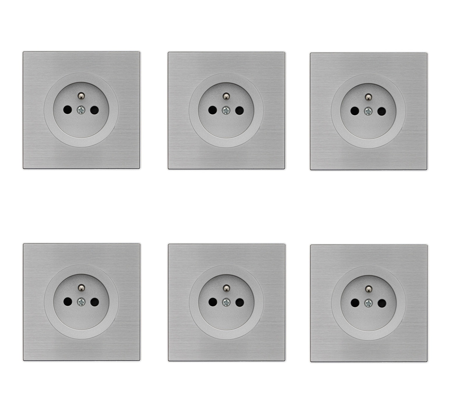 Lot de 6, Prise, DOM, Simple, Aluminium brossé, Prise-2P+T x1, L8,6cm, H8,6cm - Fontini