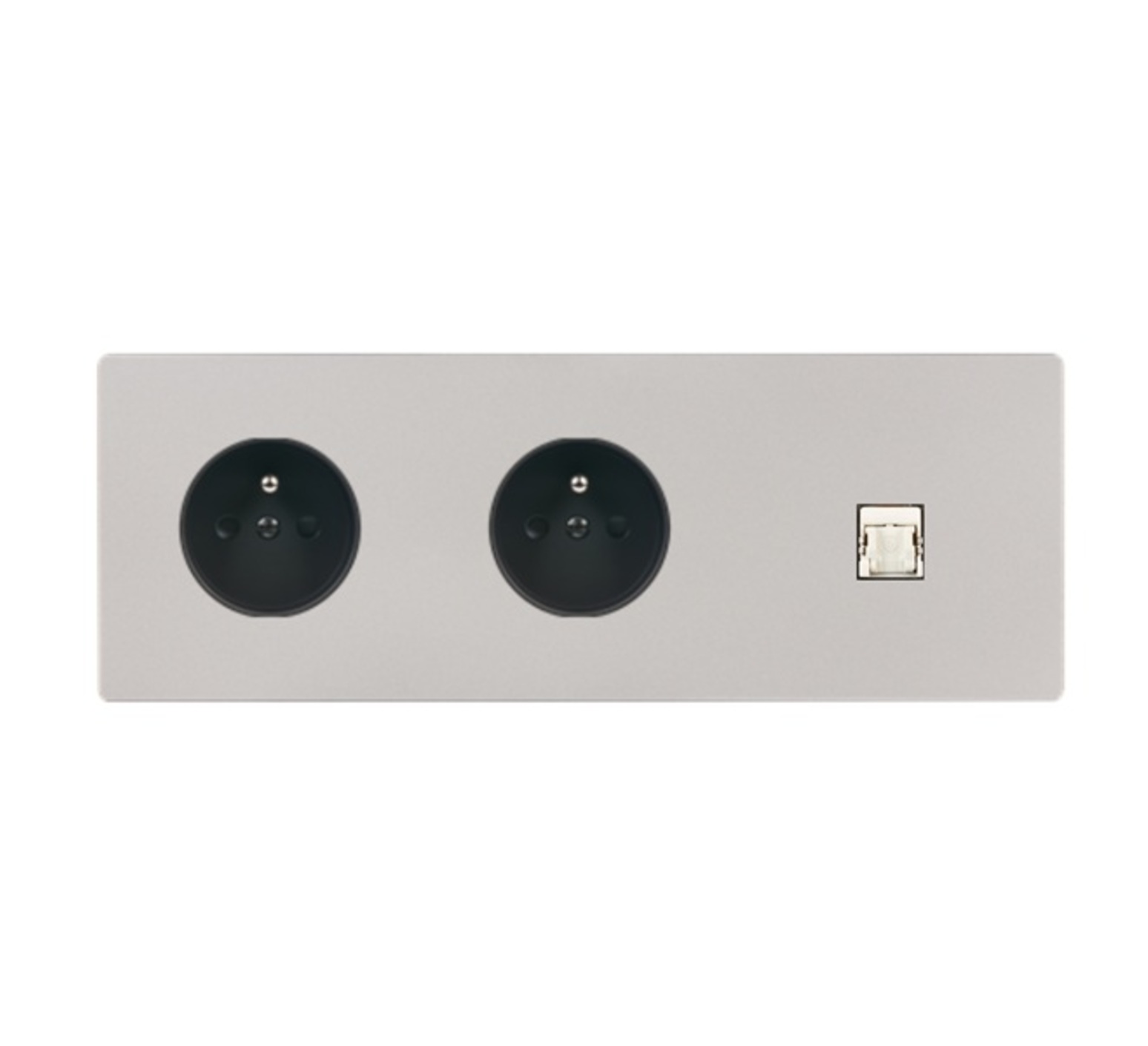 Prise, M, Triple horizontal, Nickel sablé, Prise-2P+T x2, Prise-RJ45 x1, L22,2cm, H8cm - Modelec