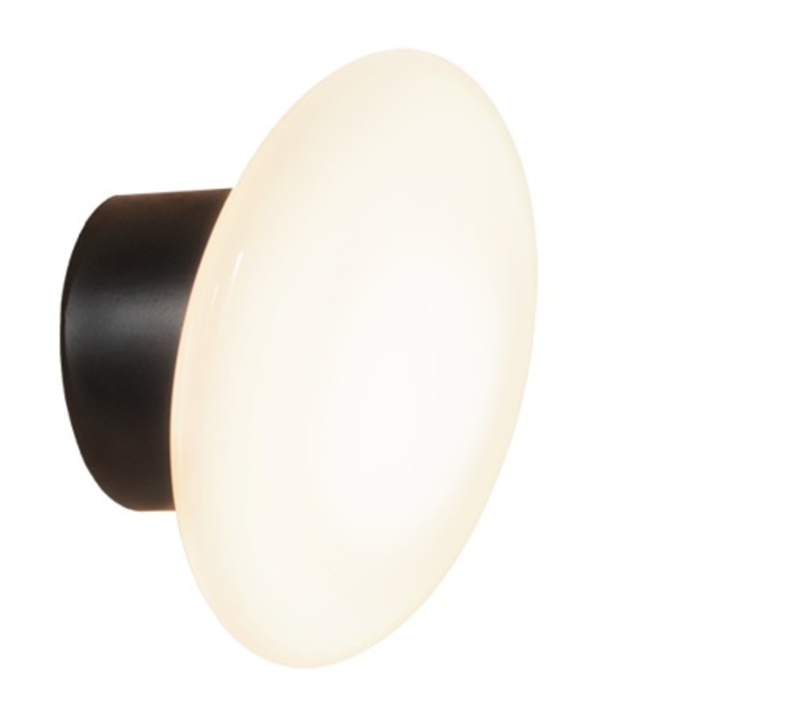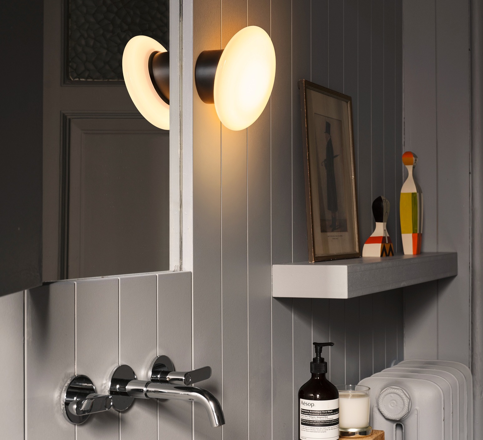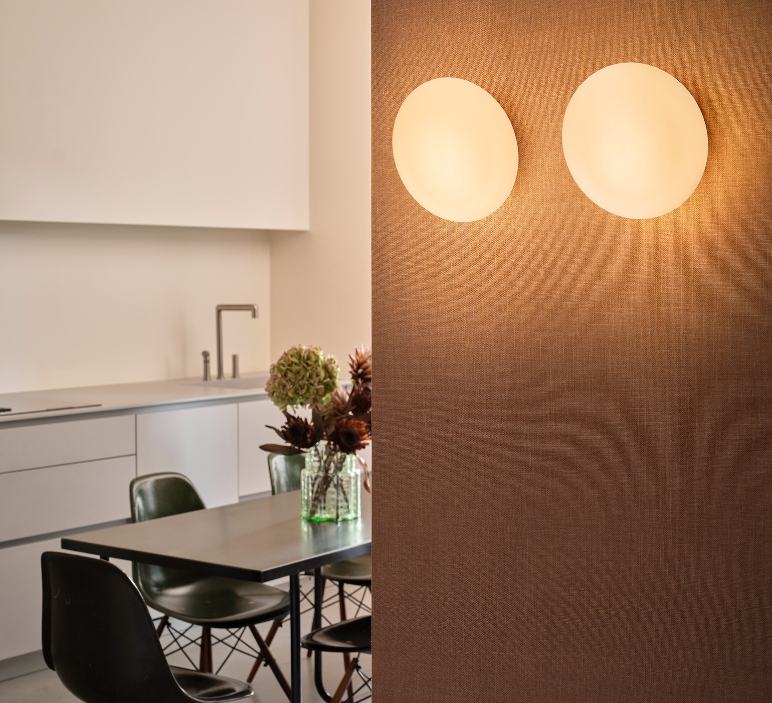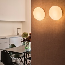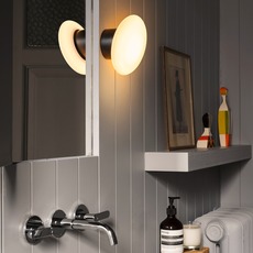 Die Wandleuchte liest sich wie ein Kissen aus mundgeblasenem Glas, das sanft gegen die Wand geneigt ist. Ihre kreisförmige, leicht abgeflachte Form fängt das Licht und die Reflexionen auf wechselnde Weise ein und bietet eine grafische und zugleich diskrete Präsenz. Der Diffusor aus poliertem Opalglas mildert die Lichtemission und tritt in einen Dialog mit der Struktur aus schwarz lackiertem Metall. Sie ist ideal für ein Badezimmer, findet aber auch ihren Platz in Durchgangsbereichen oder zeitgenössischen Innenräumen, in denen die Architektur nach einem selbstbewussten, aber maßvollen Lichtobjekt verlangt.