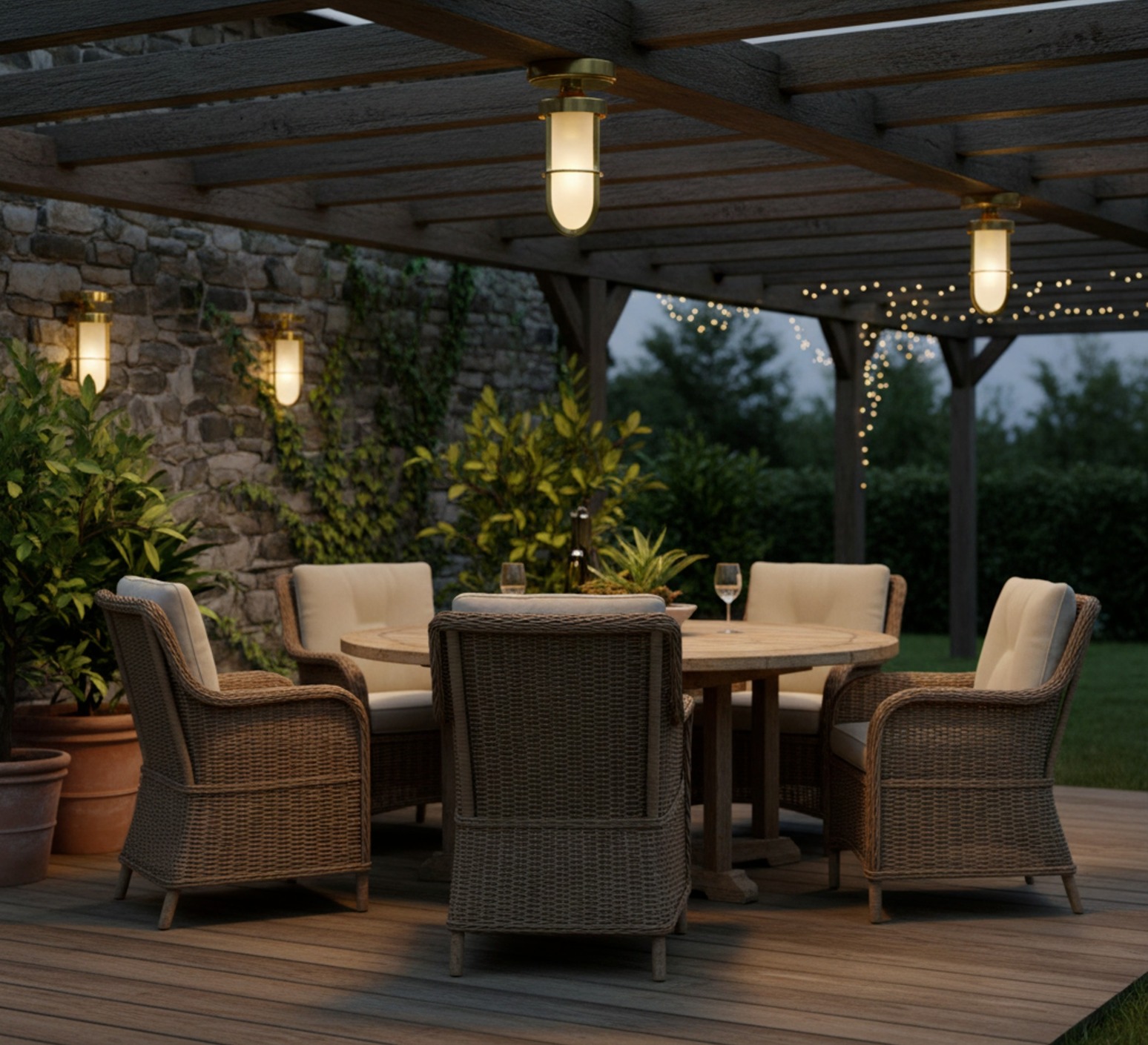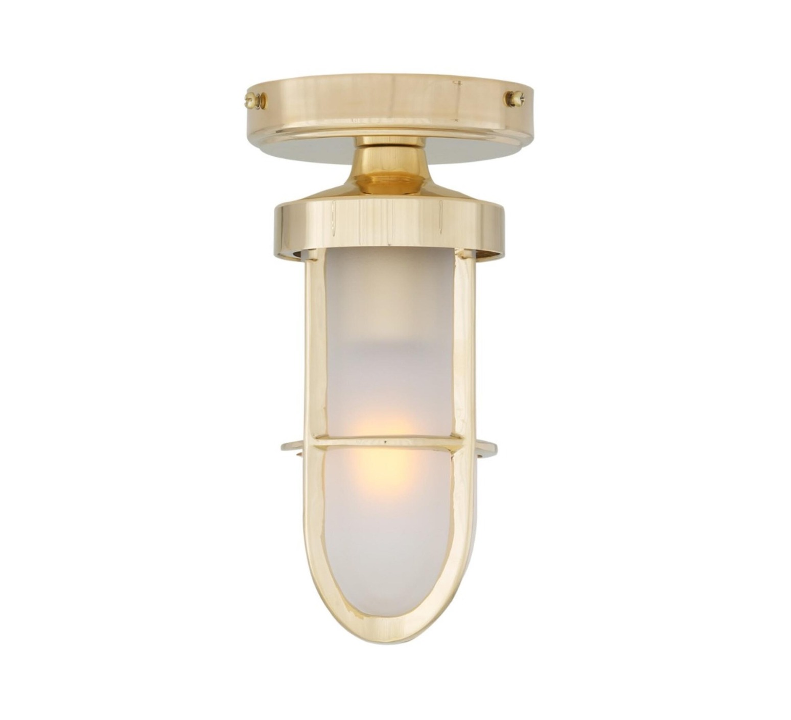 Seine Ästhetik kombiniert einen schützenden Metallkäfig aus Messing und dickes Glas, die sowohl einen nautischen Vintage-Look als auch raue Eleganz hervorrufen und ein zeitloses Lichtstück schaffen, das jeden Innen- oder geschützten Raum optisch bereichert.
