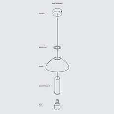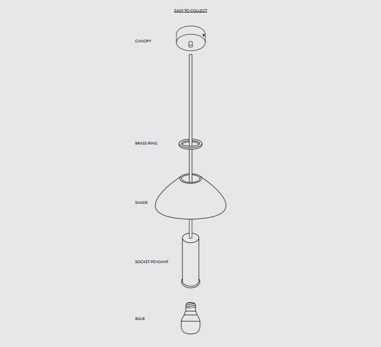 Jede Hängeleuchte besteht aus insgesamt fünf Elementen: einer Rosette, einem Kabel, einem Ring aus Messing, einem Lampenschirm und einer Fassung. Die Glühbirne ist jedoch nicht im Lieferumfang enthalten.
