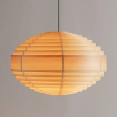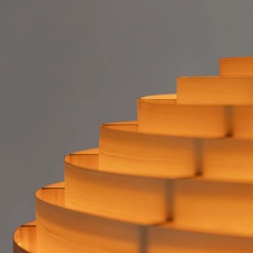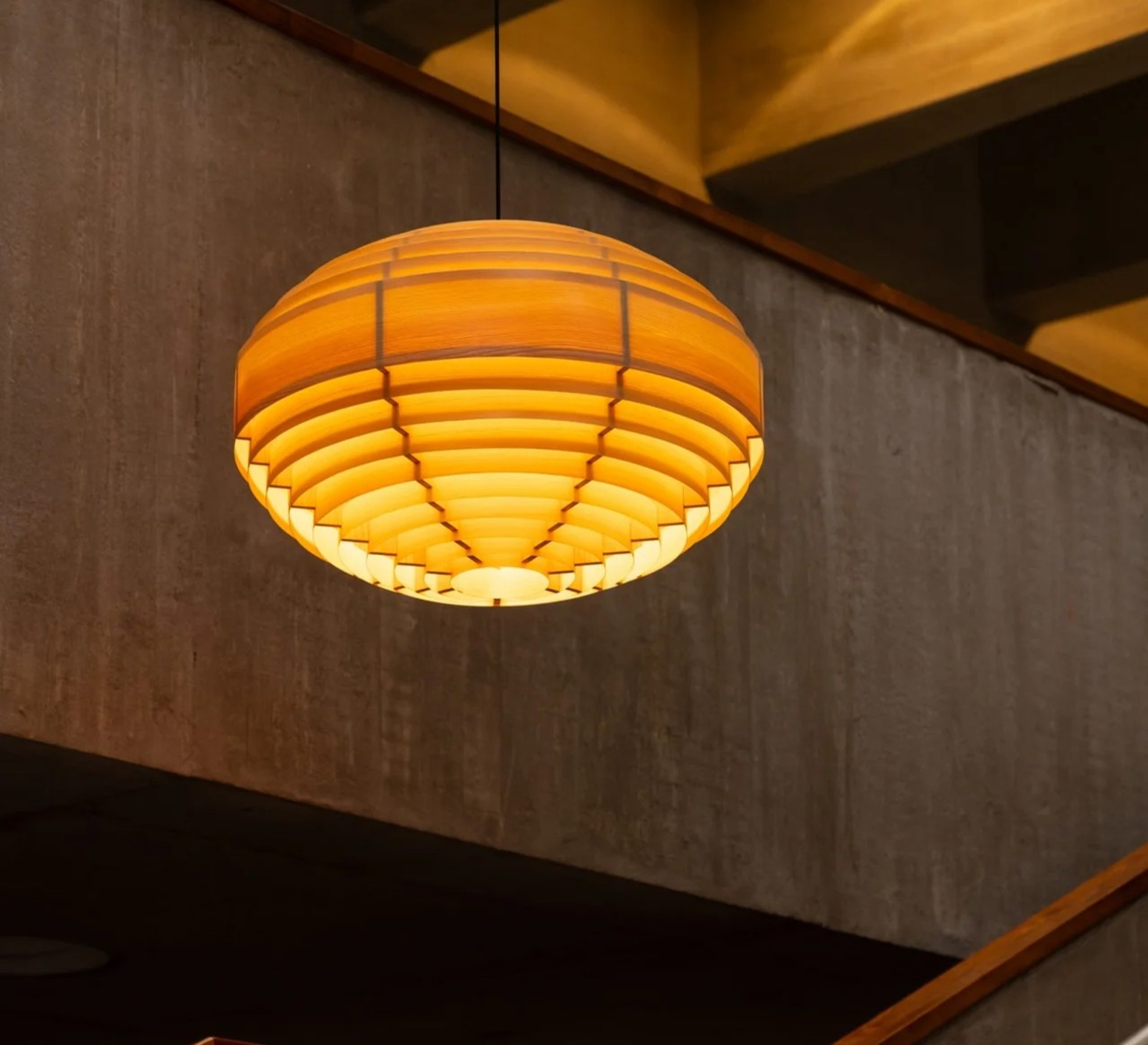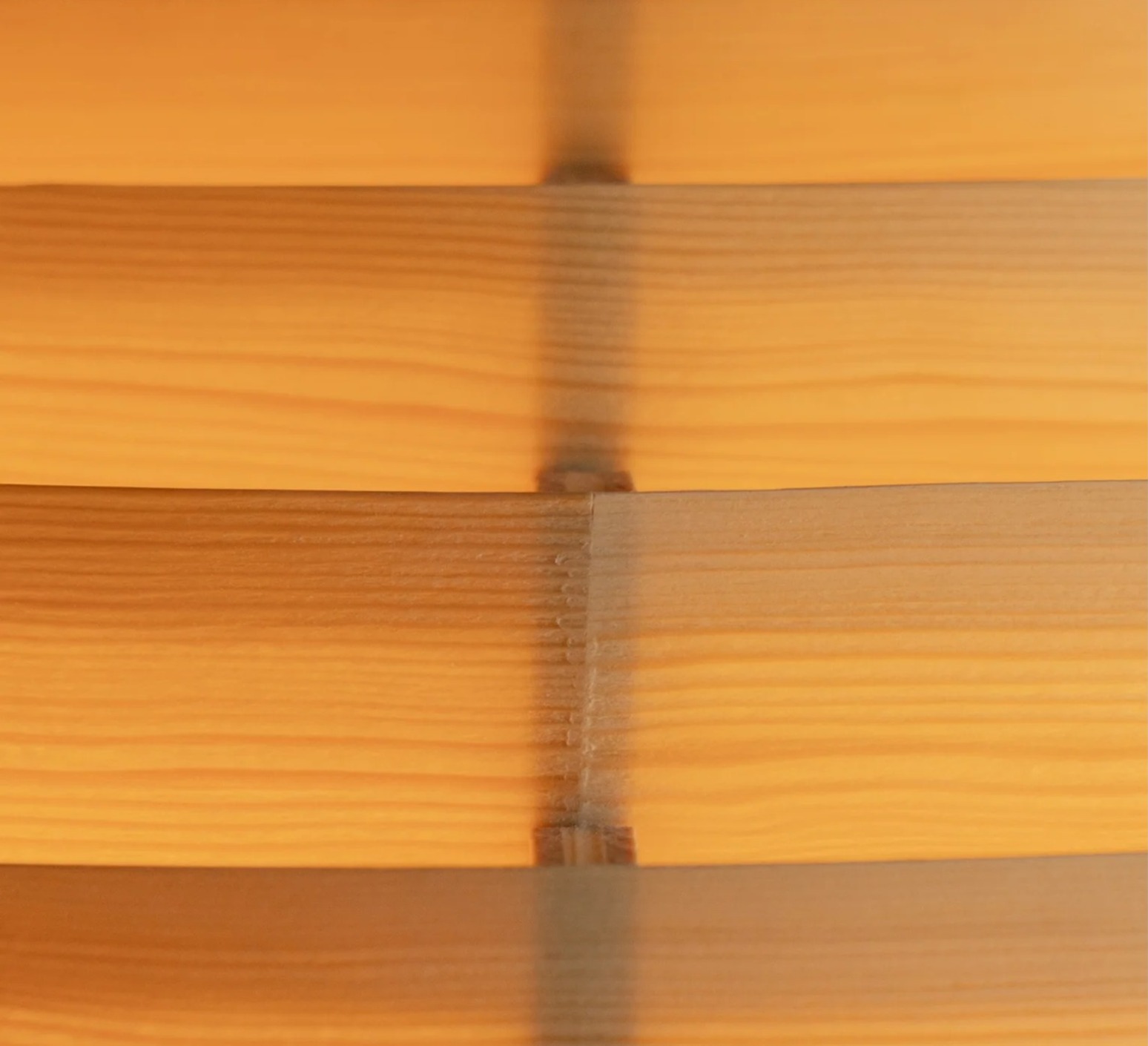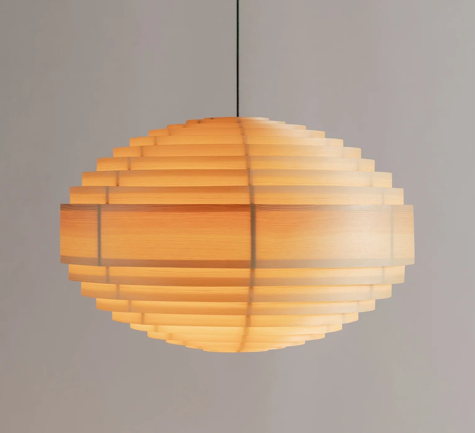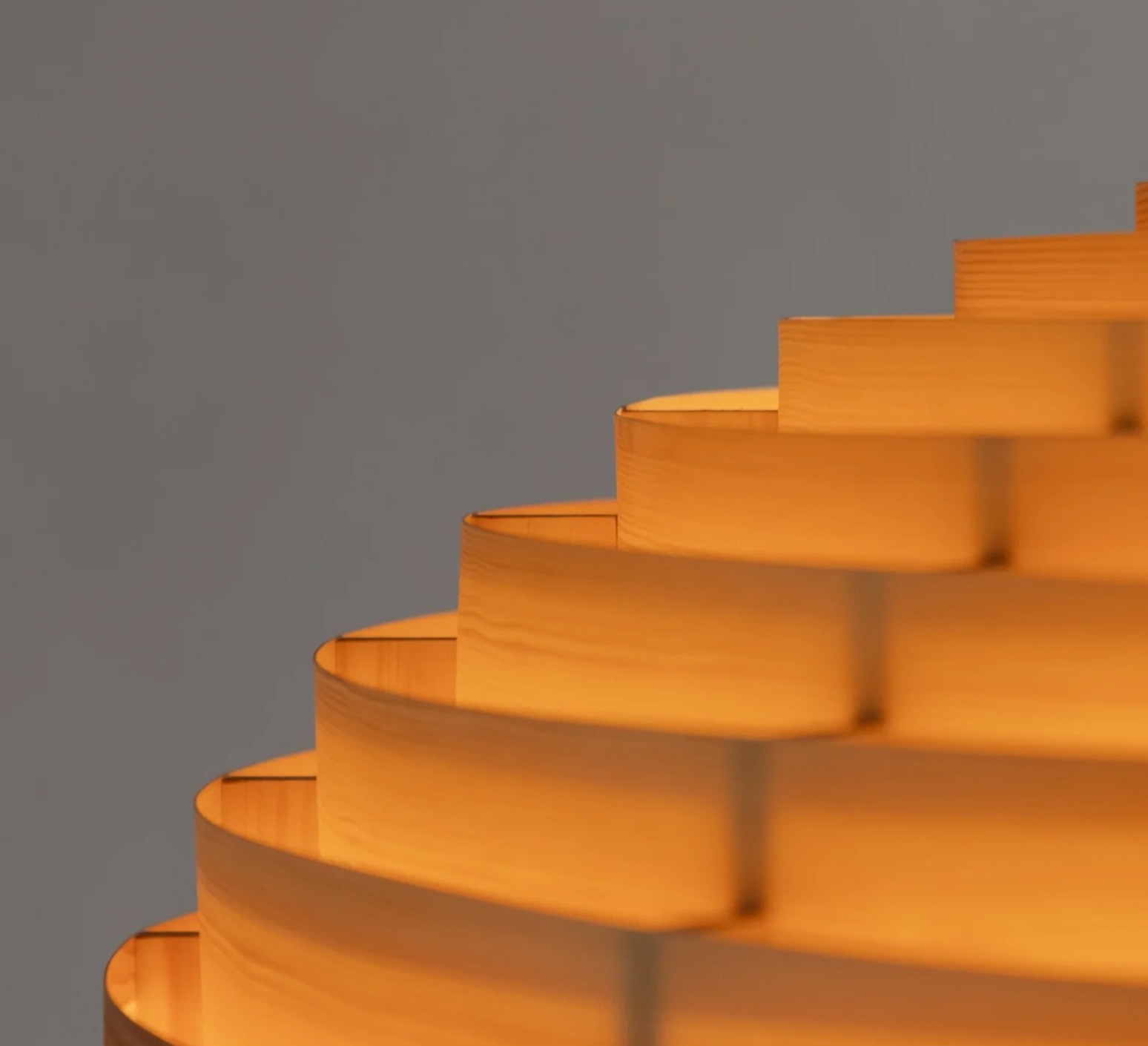 Wenn das Licht durch die Holzstreifen austritt, entsteht ein sanfter, honigfarbener Schimmer, der die Maserung hervorhebt und sowohl an die Tradition des nordischen Designs als auch an eine zeitlose organische Modernität erinnert.