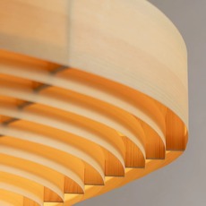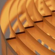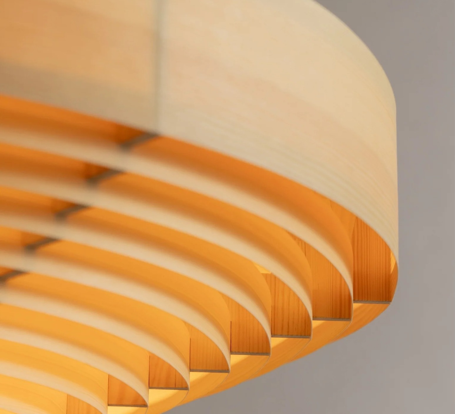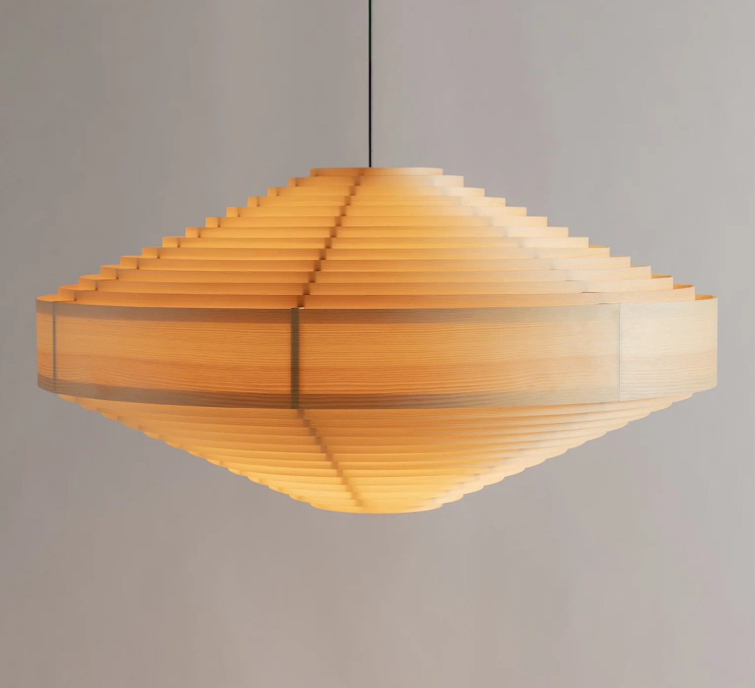 Wenn das Licht durch die Holzstreifen austritt, entsteht ein sanfter, honigfarbener Schimmer, der die Maserung hervorhebt und sowohl an die Tradition des nordischen Designs als auch an eine zeitlose organische Modernität erinnert.