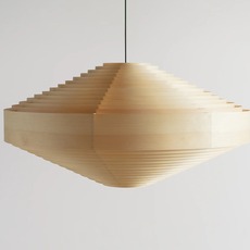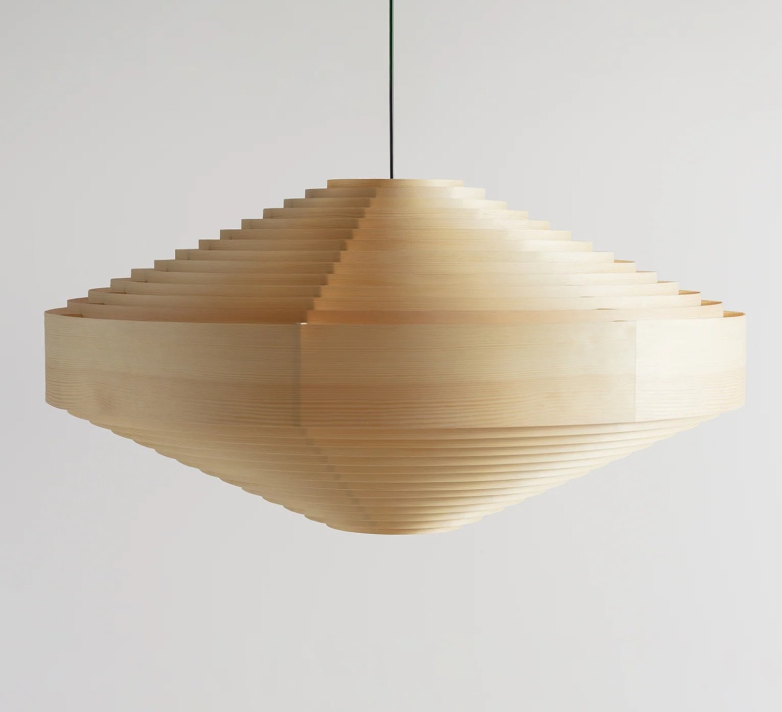 Dieses Stück interpretiert die typische grafische Kegelform des Designers neu, indem es sorgfältig verarbeitetes, natürliches finnisches Kiefernholz verwendet, das dem Lampenschirm eine warme, organische Präsenz verleiht.