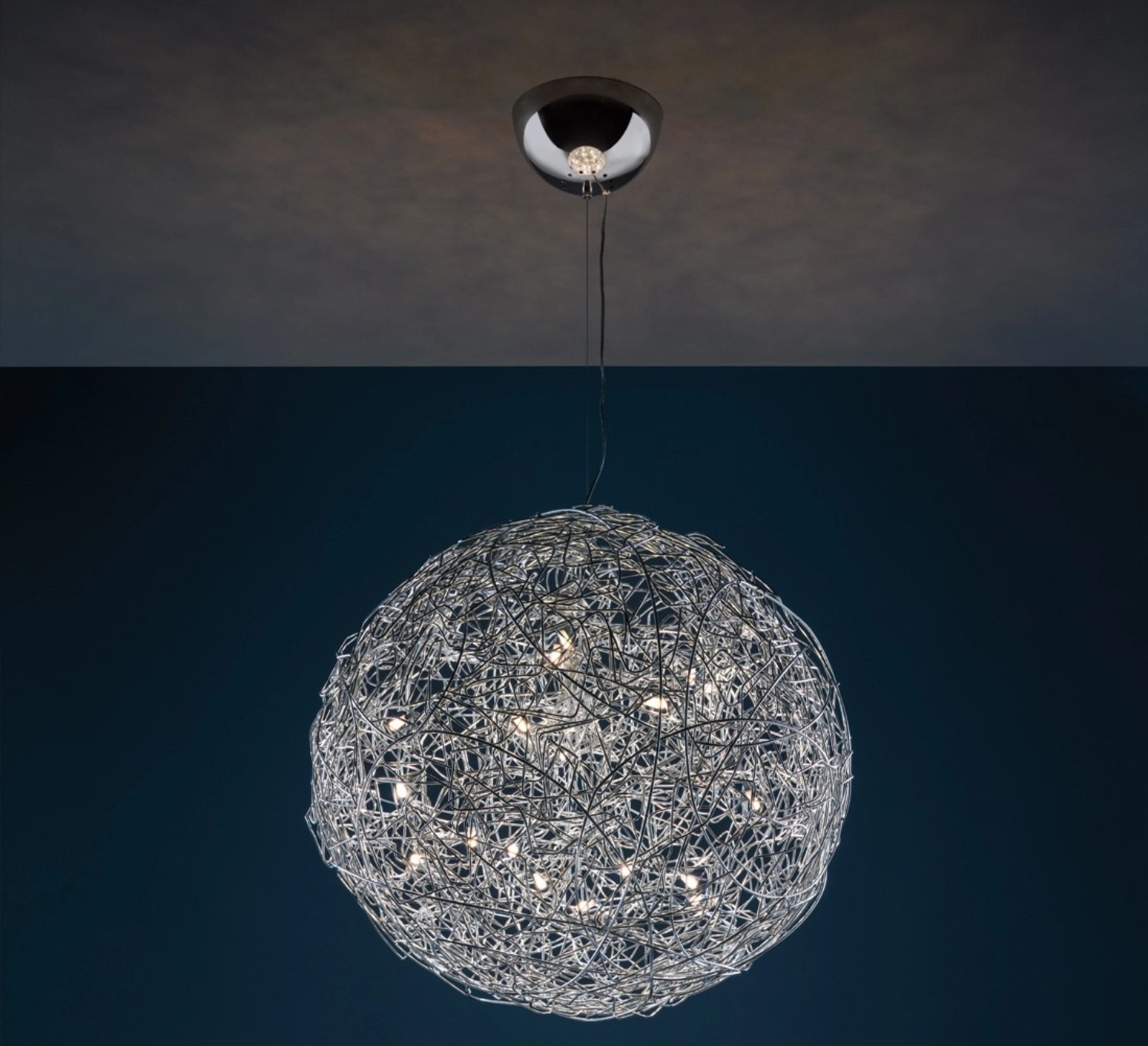 Die aus geflochtenem Aluminium gefertigte Hängeleuchte zeigt die handwerklichen Fähigkeiten des Hauses und ist eines der repräsentativsten Stücke seiner Lichtwelt.