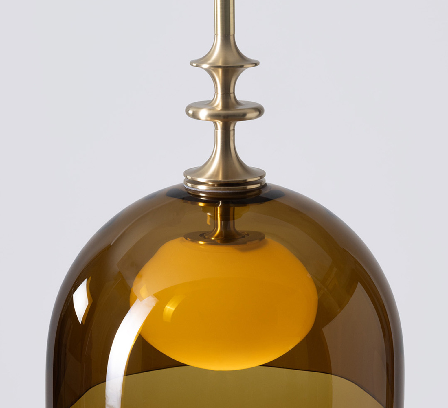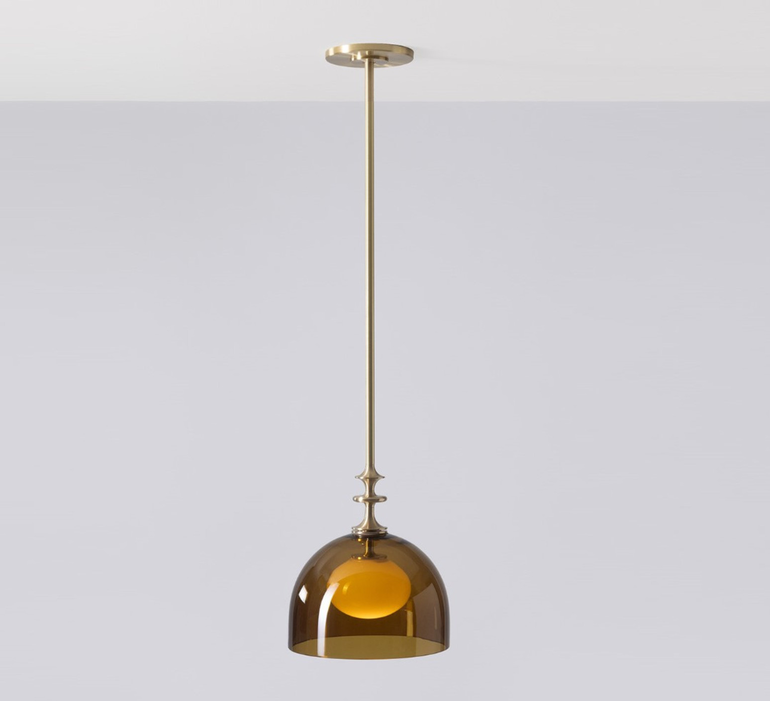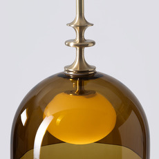Sie hat eine elegante Halbkugelform aus Olivinglas mit einer beigefarbenen Kugel, die durch Details aus gebürstetem Messing verfeinert wird, was ihr eine anspruchsvolle, grafische Ästhetik verleiht. Ihr ausgewogenes Design macht sie zur idealen Wahl über einem Tisch, in einem Eingangsbereich oder als Mehrfachkomposition in einem Wohnzimmer, wo sie einen starken dekorativen Akzent setzt und gleichzeitig zeitlos bleibt.