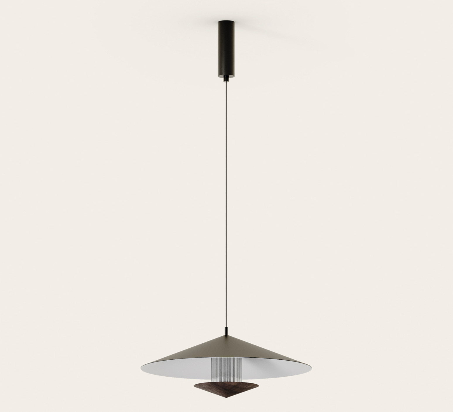 Die Hängeleuchte mit ihrer selbstbewussten Kegelform kombiniert einen mattschwarzen Metallschirm mit einem Zylinder aus geriffeltem Glas, der auf einem umgekehrten Kegel aus dunklem Walnussholz ruht, wodurch ein elegantes Spiel von Materialien und Transparenzen entsteht. Ihre luftige, strukturierte Silhouette passt charaktervoll über einen Tisch, eine Insel oder in einen modernen Wohnbereich, wo sie eine skulpturale Präsenz verleiht und gleichzeitig raffiniert bleibt.