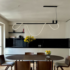 Mit ihrem schwarzen Finish und ihrem röhrenförmigen Design fügt sich die Hängeleuchte KAA LINE problemlos in zeitgenössische oder eher klassische Innenräume ein und verleiht ihnen einen Hauch von Glanz und Modernität. Die Leuchte eignet sich besonders gut für die Anbringung über einem Esstisch, im Wohnzimmer oder im Büro, wo sie eine warme und zugleich elegante Lichtatmosphäre schafft. Ihr minimalistischer Look und ihre klare Linie passen zu verschiedenen Einrichtungsstilen, von schlicht bis grafisch. Die beste Wirkung erzielen Sie, wenn Sie die Lampe mit modernen Dekorationselementen kombinieren, die im Kontrast zu natürlichen Materialien wie Holz oder Stein stehen.