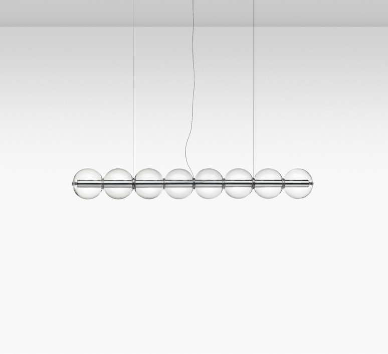 Ihre mundgeblasenen Glaskugeln, die sanft auf einer dünnen Aluminiumstruktur ruhen, verbreiten ein weiches, umhüllendes Licht. Die schlanke und skulpturale Pendelleuchte erinnert an Laternen, die in der Luft hängen und eine beruhigende und raffinierte Atmosphäre schaffen. Luce Sferica ist mehr als eine Leuchte, sie ist ein modulares Stück, das den Raum auf elegante Weise verwandeln kann.
