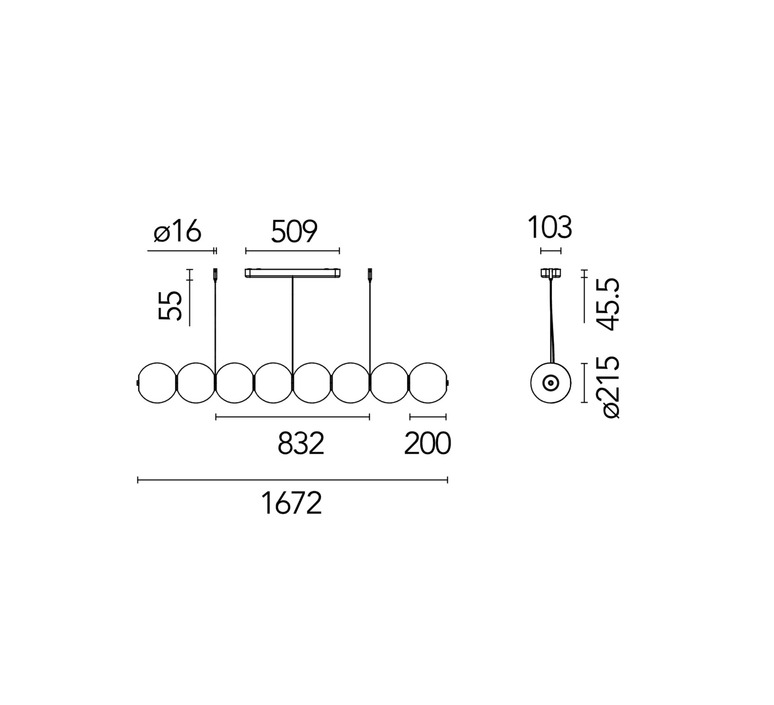 Die Pendelleuchte hat einen Durchmesser von 21,5 cm und eine Länge von 167,2 cm.