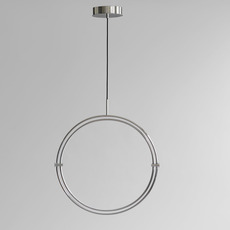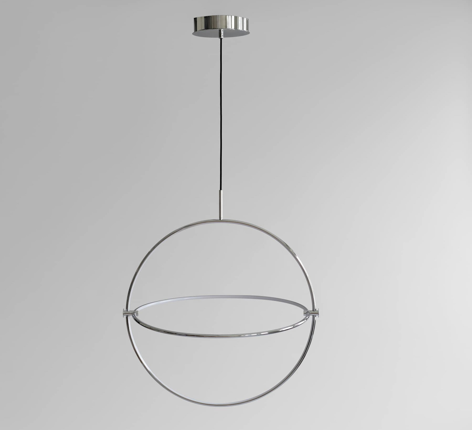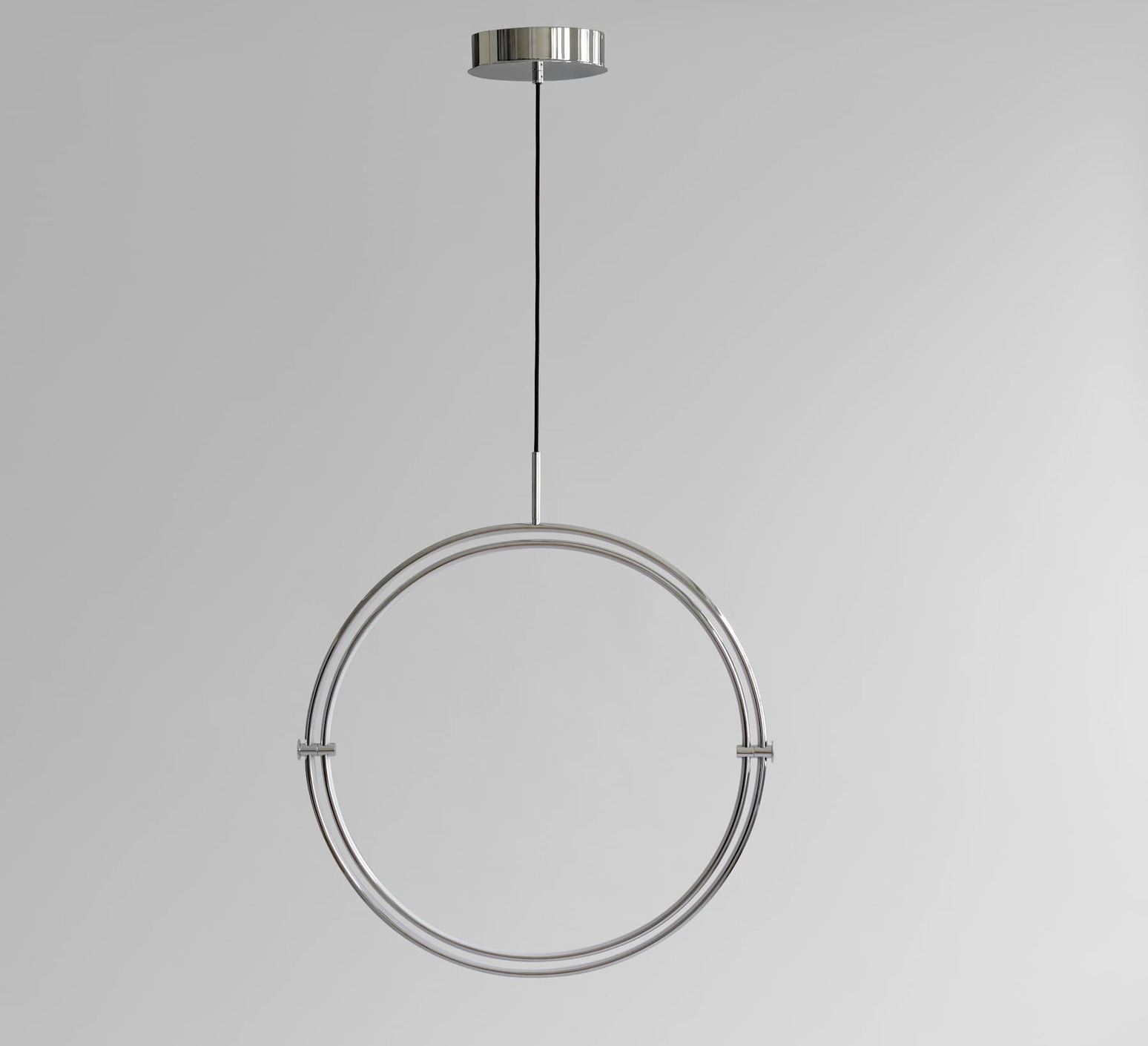 Maru Ø60 besteht aus zwei akribisch gearbeiteten Aluminiumkreisen, die jeweils mit einer integrierten LED-Lampe ausgestattet sind, die das Innere des Kreises beleuchtet. Ein bewegliches Gelenk auf jeder Seite ermöglicht es dem inneren Kreis, sich innerhalb des äußeren Kreises zu drehen und bietet so Flexibilität und modulare Kompositionen. Die Pendelleuchten können einzeln als skulpturale Stücke verwendet oder zu einer Gruppe zusammengefasst werden, um eine dynamische und verspielte Beleuchtung zu schaffen. Die kreisförmige Einfachheit und das Chrom-Finish verleihen jedem Raum Wärme und Eleganz und verstärken die Modernität und Vielseitigkeit des Designs.