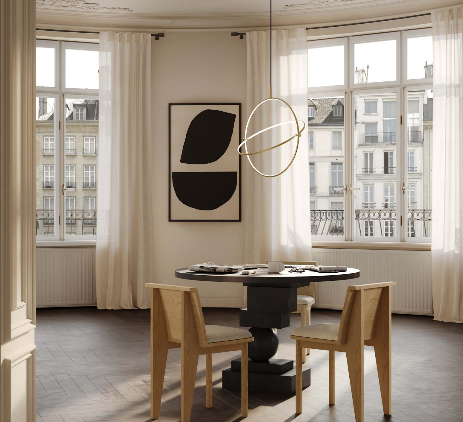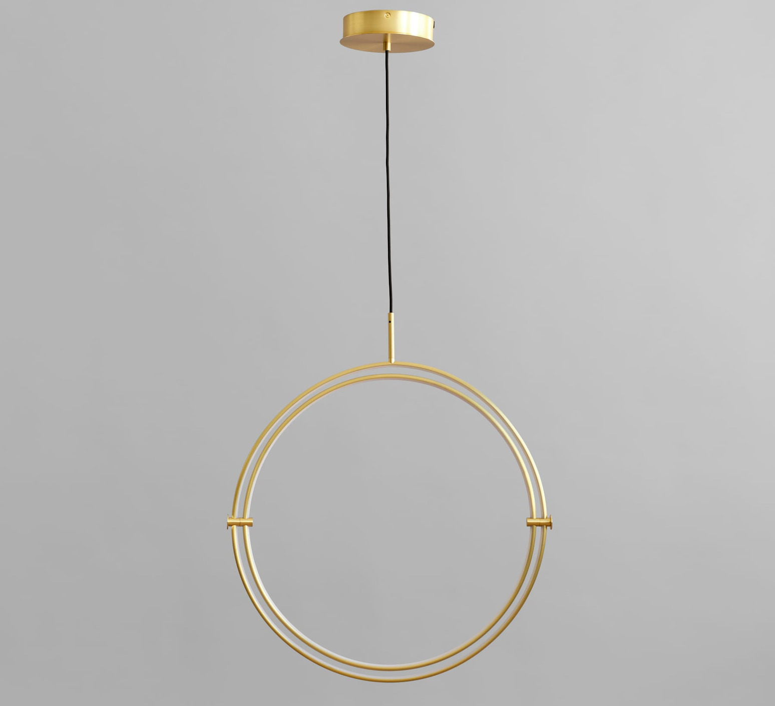 Maru Ø60 besteht aus zwei akribisch gearbeiteten Aluminiumkreisen, die jeweils mit einer integrierten LED-Lampe ausgestattet sind, die das Innere des Kreises beleuchtet. Ein bewegliches Gelenk auf jeder Seite ermöglicht es dem inneren Kreis, sich innerhalb des äußeren Kreises zu drehen und bietet so Flexibilität und modulare Kompositionen. Diese Hängeleuchten können einzeln als skulpturale Stücke verwendet oder zu einer Gruppe zusammengefasst werden, um eine dynamische und verspielte Beleuchtung zu schaffen. Die kreisförmige Schlichtheit und das gebürstete Messingfinish verleihen jedem Raum Wärme und Eleganz und unterstreichen die Modernität und Vielseitigkeit des Designs.