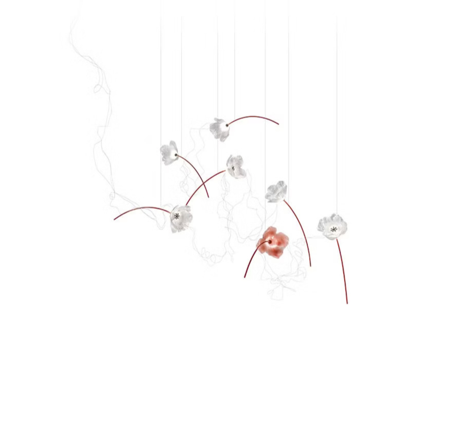 Die handgefertigten, lichtdurchlässigen Blüten entfalten einen fesselnden Prismeneffekt, der das Licht um 360° streut. Über einem Esstisch, in einem Wohnzimmer oder einem Empfangsbereich aufgehängt, setzt Poppy 7 einen organischen und grafischen dekorativen Akzent, der Lichtkunst und Design miteinander verbindet. Die roten Akzente sorgen für eine poppige Vibration, die sowohl klaren Linien als auch gewagteren Einrichtungsstilen subtil Leben einhaucht.