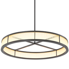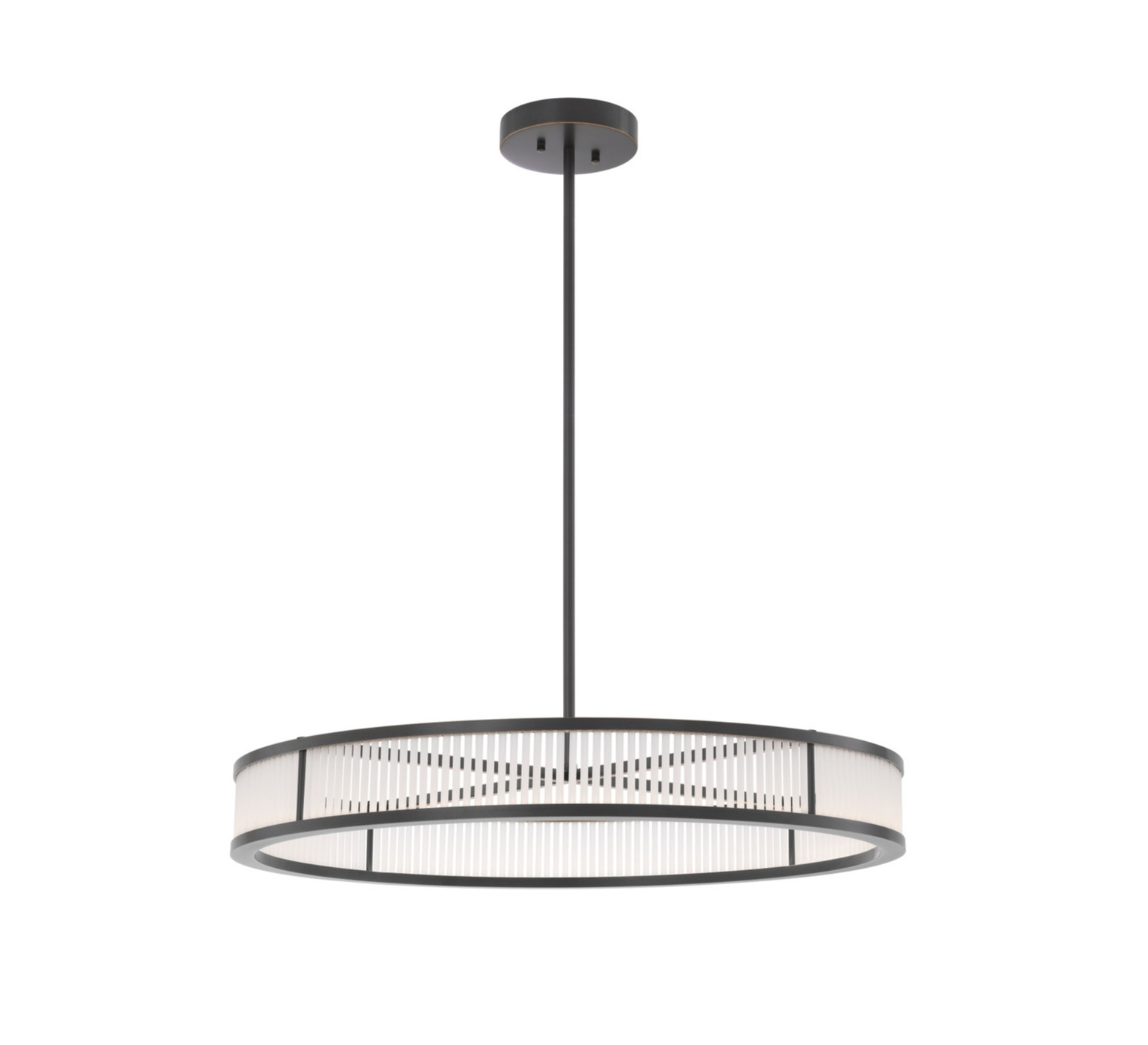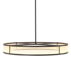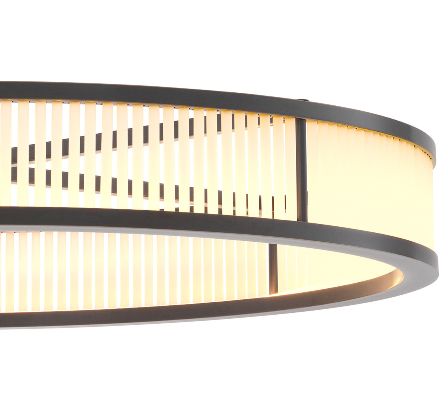 Ihr kreisförmiges Design verbindet eine Metallstruktur mit Bronzefinish mit Stäben aus gefrostetem Glas und schafft so ein ausgewogenes Spiel aus Linien und Licht. Sie findet ganz natürlich ihren Platz in einem Wohn-, Ess- oder Schlafzimmer. Einzeln verwendet, strukturiert sie den Raum; vervielfacht ermöglicht sie es, verschiedene Rhythmen zu komponieren, indem man mit der Höhe der Aufhängung spielt, um eine harmonische Inszenierung zu erreichen.