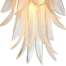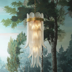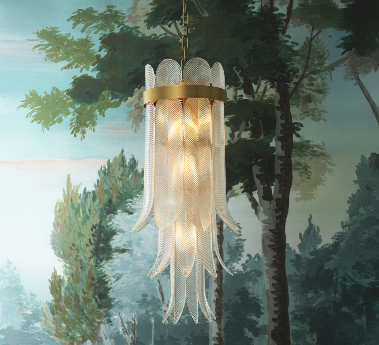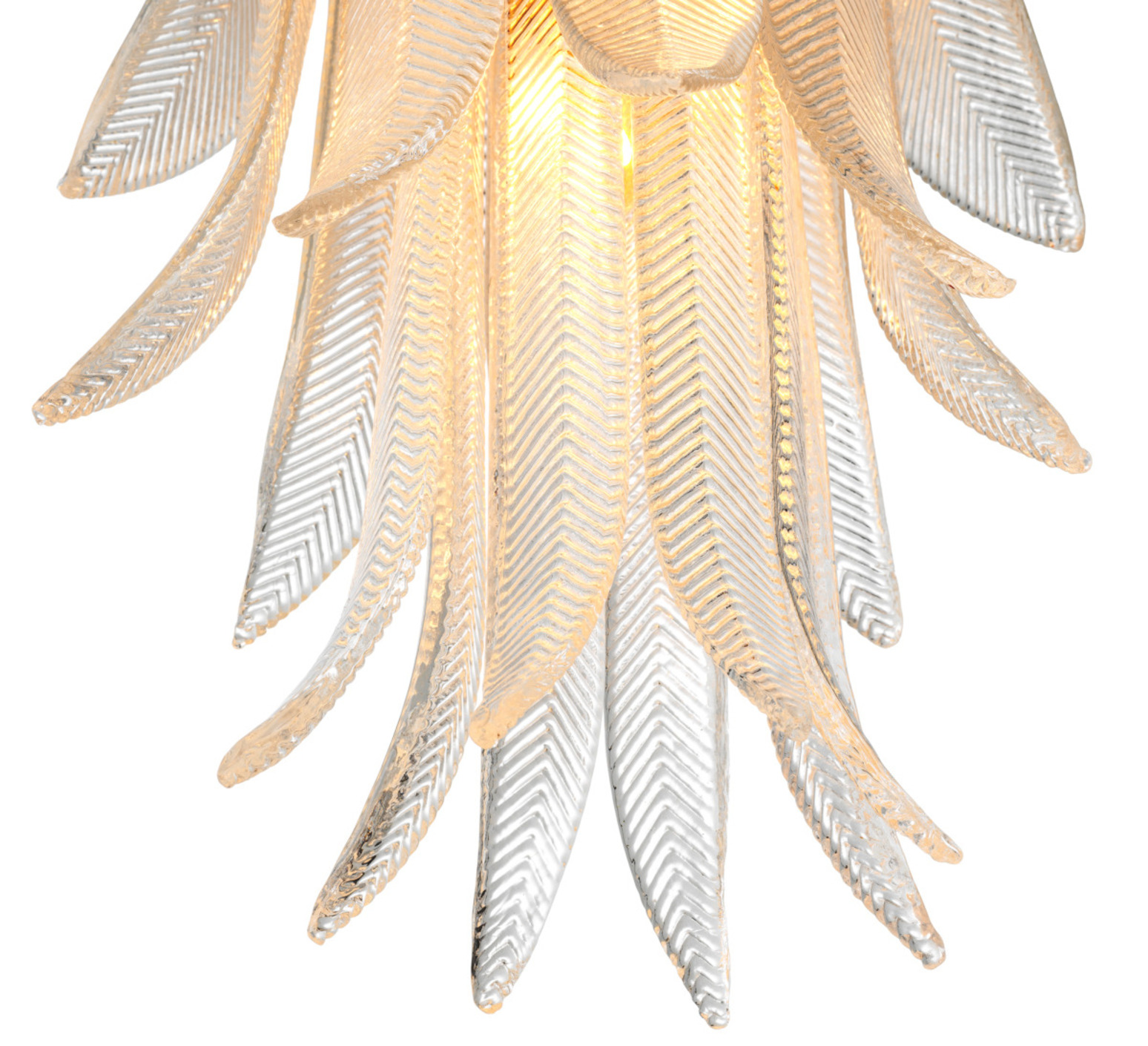 Sein Design erinnert an das Art Déco und die Ästhetik von Schmuckstücken aus den 1920er Jahren, mit gerippten Glaselementen, die das Licht auffangen und einen sanften, umhüllenden Lichteffekt rundherum erzeugen. Die Kombination aus klarem Glas und antikem Messing sorgt für Kontrast und Wärme. Sie passt über einen Tisch, in einen hohen Eingangsbereich, ein Wohnzimmer oder einen Empfangsbereich. Für ein stimmiges Gesamtbild lässt es sich mit strukturierten Materialien, Metallic-Oberflächen und tiefen oder neutralen Paletten kombinieren.