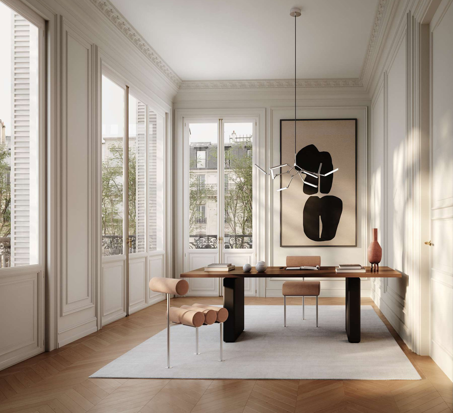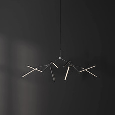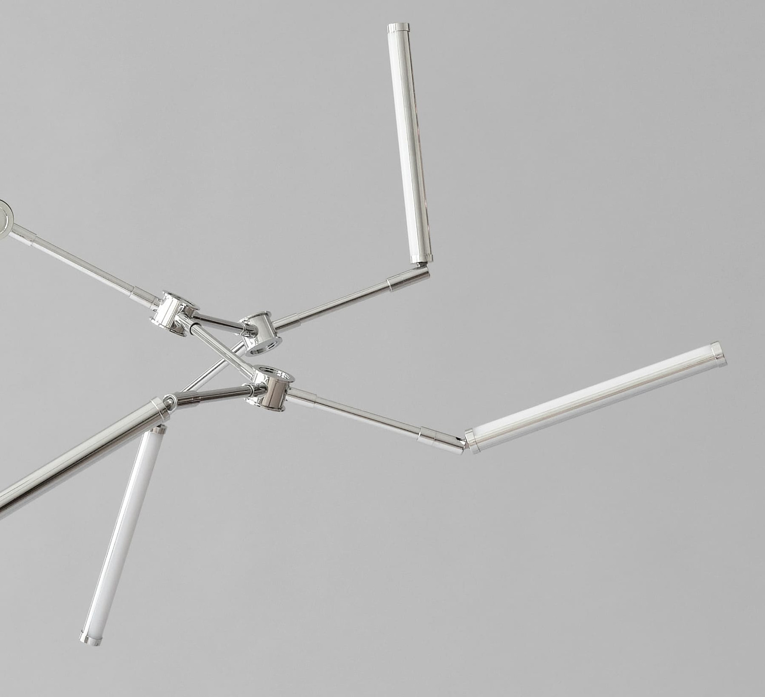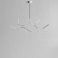 Der Kronleuchter Stick, der von der Bildsprache der 80er Jahre inspiriert ist, zeichnet sich durch seine langgestreckten Linien und seine diffuse 360°-Beleuchtung aus. Jeder der acht Arme kann gedreht werden, um individuelle Kompositionen zu schaffen - symmetrisch oder dynamisch, je nach gewünschter Stimmung. Das weiße Acrylrohr beherbergt eine integrierte LED-Lichtquelle, die ein warmes Licht von 2400 K ausstrahlt, das den Raum in eine einladende und beruhigende Atmosphäre hüllt. Die Metallverbindungen aus Chrom und die schlichten Befestigungen unterstreichen den grafischen Charakter der Leuchte, die ideal ist, um ein Esszimmer, ein Wohnzimmer oder einen offenen architektonischen Raum zu veredeln.