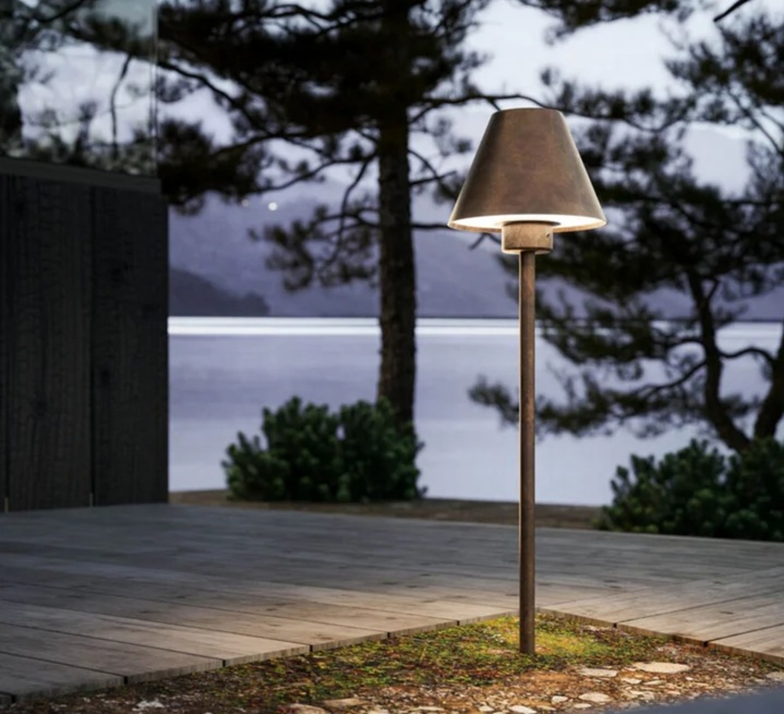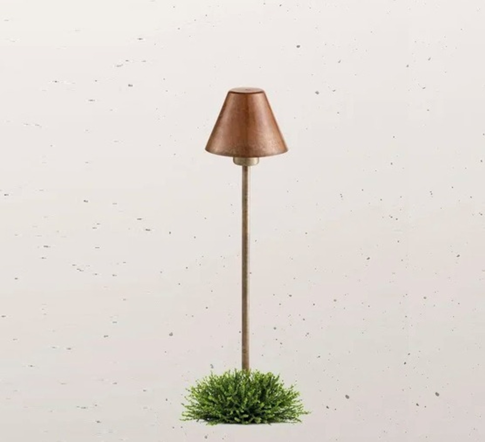Seine Komposition greift die klassischen Codes des Lampenschirms auf: vertraute Silhouette, ausgewogene Proportionen und zeitloses Design, neu interpretiert in einer Version, die speziell für den Gebrauch im Freien geeignet ist. Inspiriert vom nordischen Stil, zeichnet sie sich durch schlichte Linien aus, während Messing und Kupfer ihr eine warme und authentische Präsenz verleihen, um einladende Atmosphären im Freien zu schaffen.
