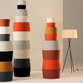 Entdecken Sie die Stehleuchte Nilo, die aus einem schwarzen Gestell und einem weißen Lampenschirm besteht, aus dem Hause Karman.