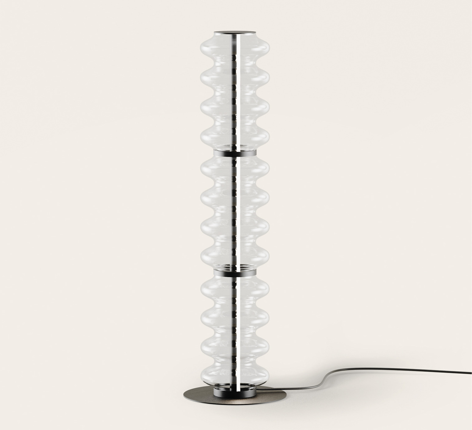 Ihre Struktur mit Metallstab in mattschwarzem Finish beherbergt einen wellenförmigen zylindrischen Diffusor aus transparentem Glas, der die Lichtquelle mit Leichtigkeit und Grafik enthüllt. Seine schlanke und ausgewogene Silhouette macht ihn zu einem skulpturalen Stück, das sich für moderne, Art-Deco- oder grafische Einrichtungen eignet. Er ist ideal, um ein Wohnzimmer zu strukturieren, einen Lesesessel zu begleiten oder einen Verkehrsraum hervorzuheben.