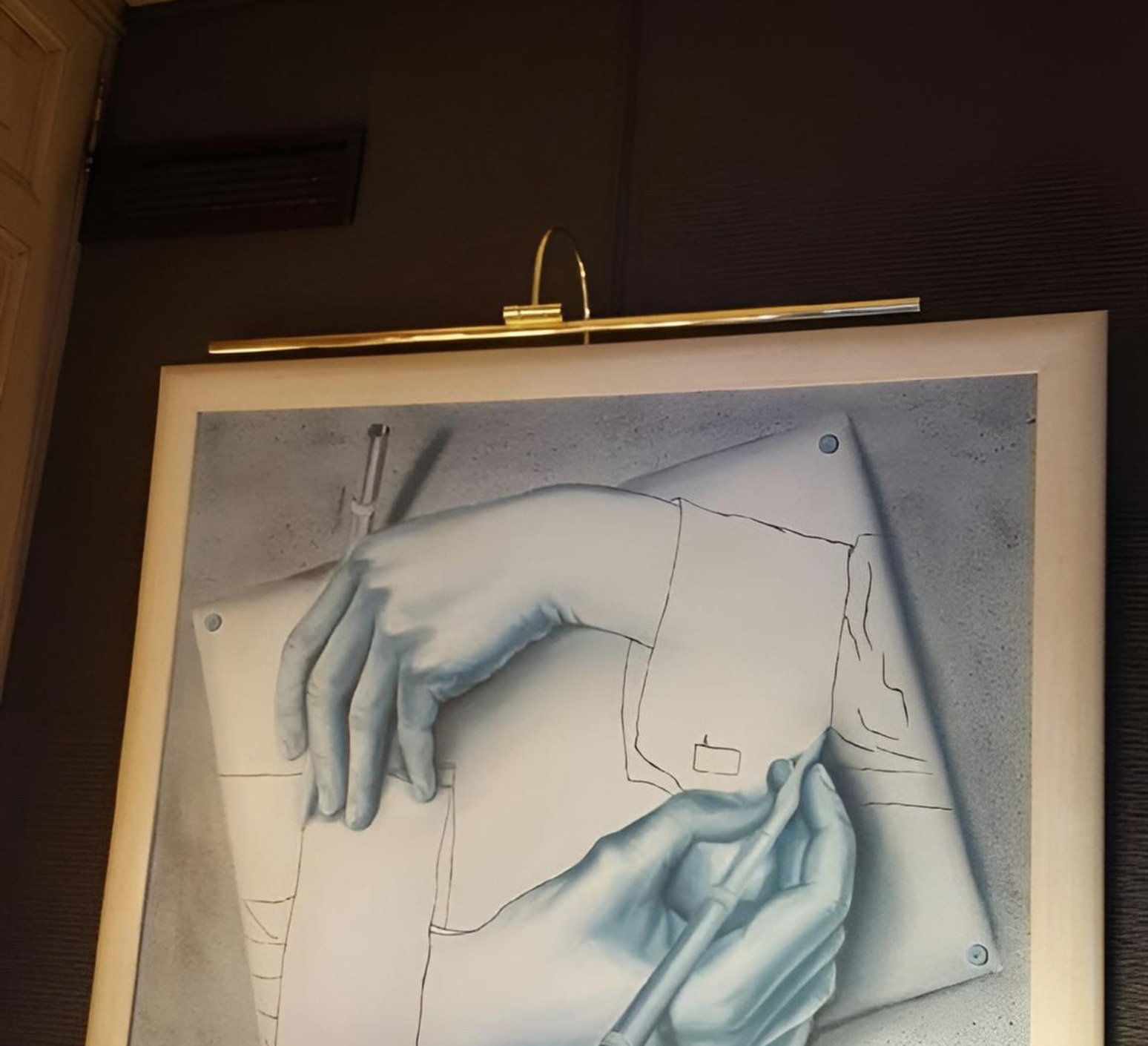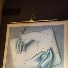 Ihre Oberfläche aus gebürstetem, matt lackiertem Messing verleiht ihr eine dezente, aber selbstbewusste Präsenz. Ideal über einem Gemälde oder einer Fotografie, lässt sie sich präzise befestigen, um die Texturen und Nuancen der Medien hervorzuheben. Dieses Modell fügt sich natürlich in ein nüchternes Ambiente mit klaren Linien ein und lässt sich leicht mit natürlichen Materialien oder neutralen Paletten kombinieren.