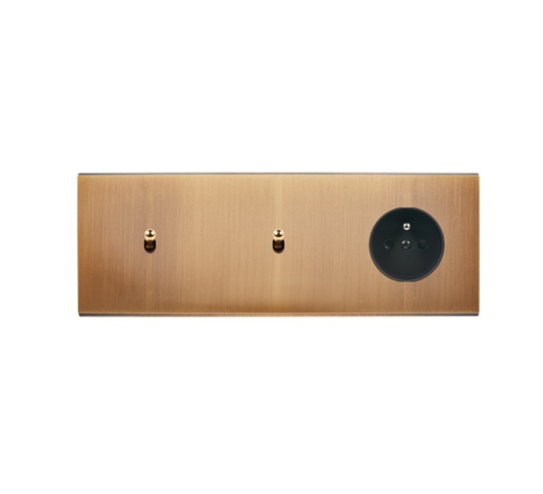 This triple horizontal switch measures L22.2cm x H8cm and is equipped with a 2P+T x1 socket, a x1 roller shutter and a x1 two-way switch. Made of brass, this product is compatible with a standard flush-mounting box, guaranteeing easy, secure installation.