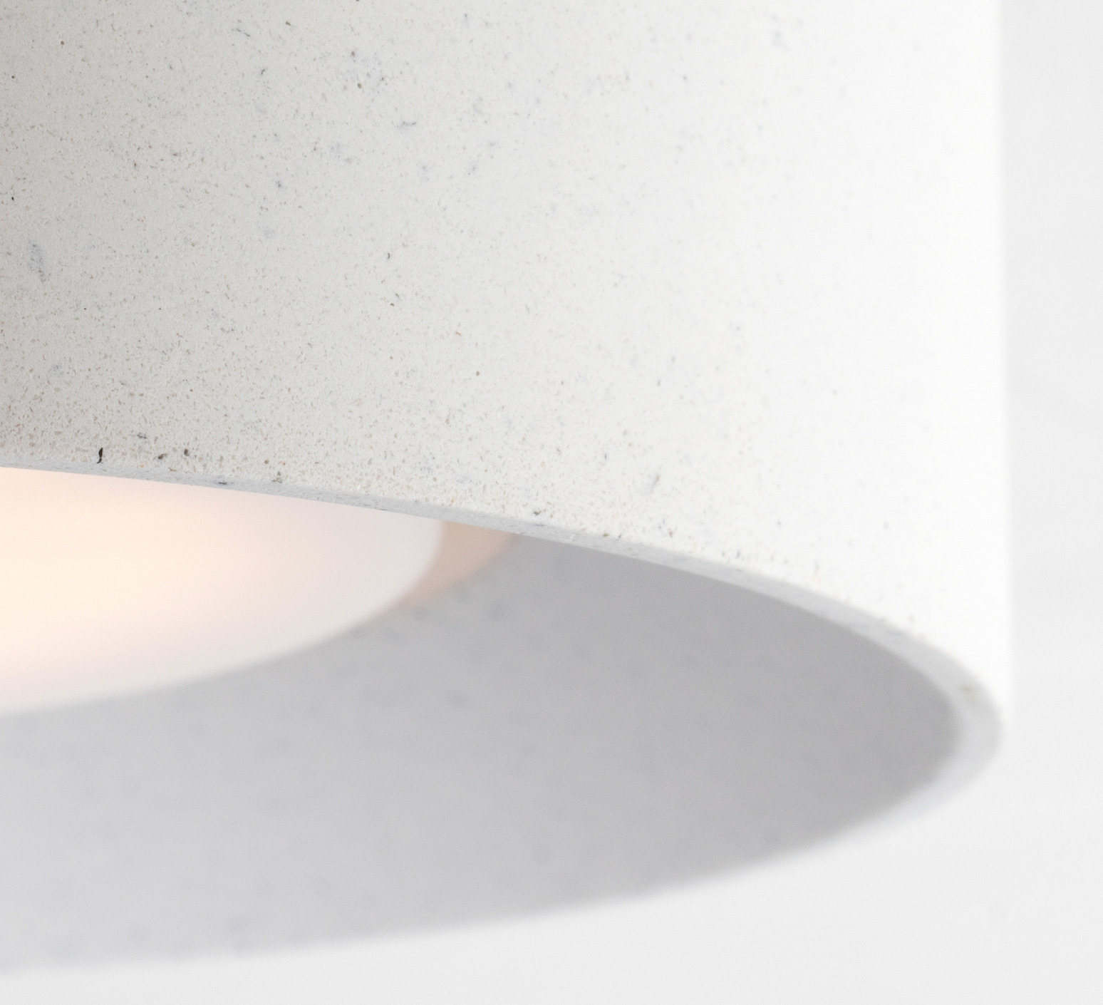 It is part of Plato's own aesthetic universe: a combination of simple shapes and raw materials, often inspired by natural textures or a soft industrial approach, which gives the ceiling a discreet yet elegant luminous presence.