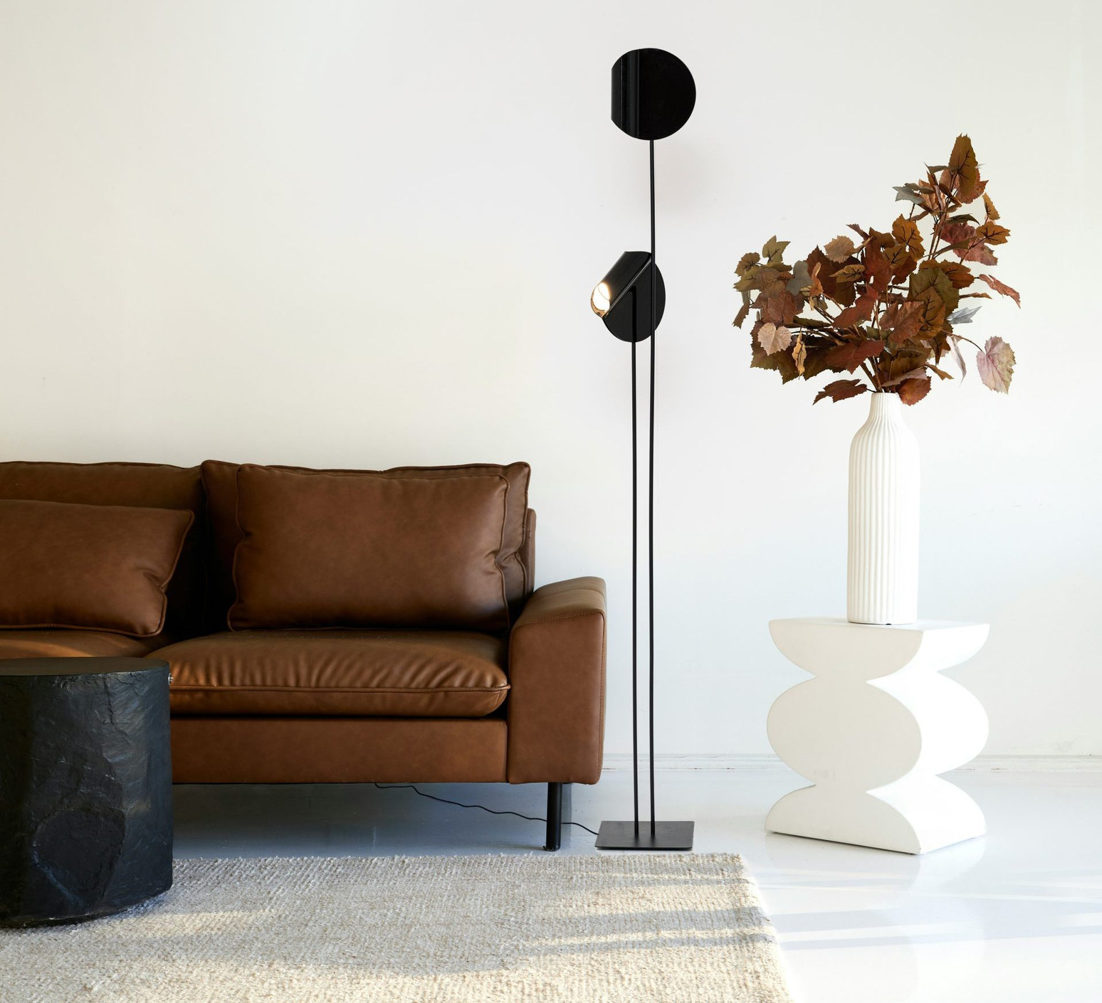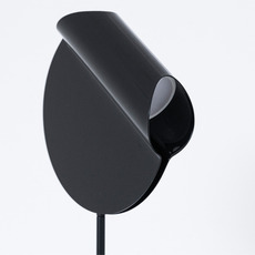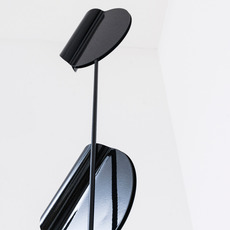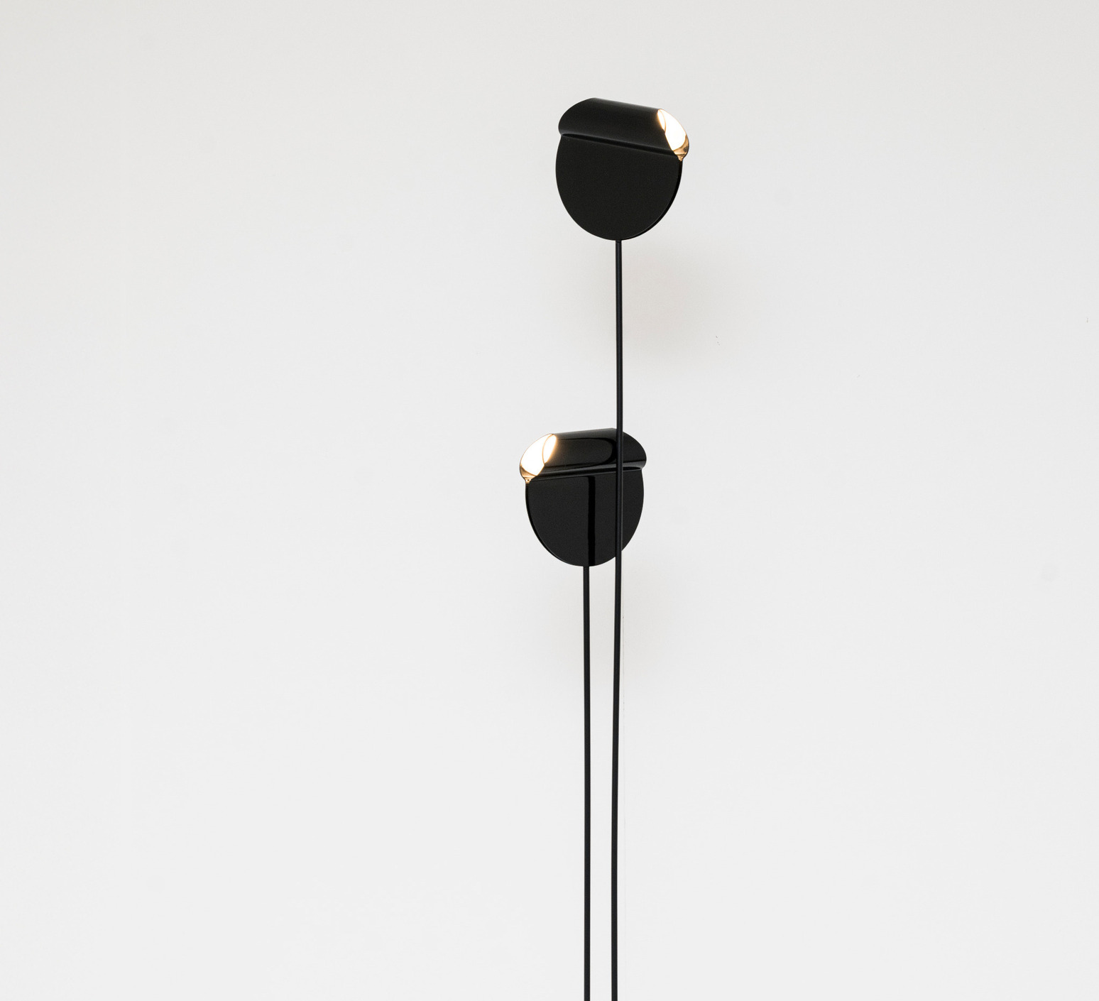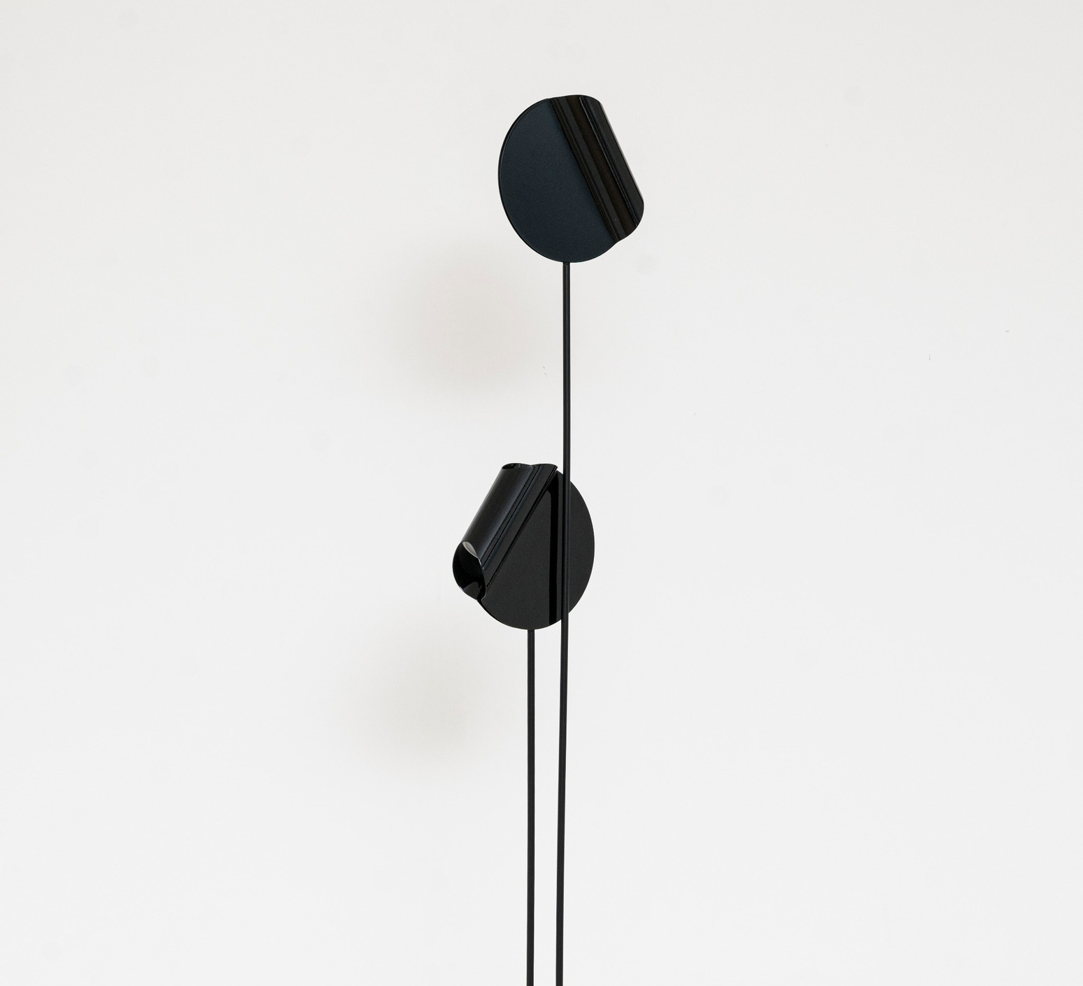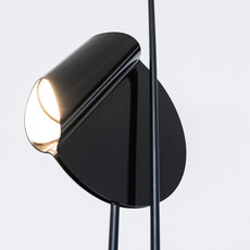 Its slender steel structure affirms the geometric purity of the collection. Finished in high-gloss black, with matte stem and high-gloss light heads, it creates a subtle contrast between structural rigor and luminous volume. Installed in a living room or reading corner, it punctuates the space with elegance while offering a controlled graphic presence.