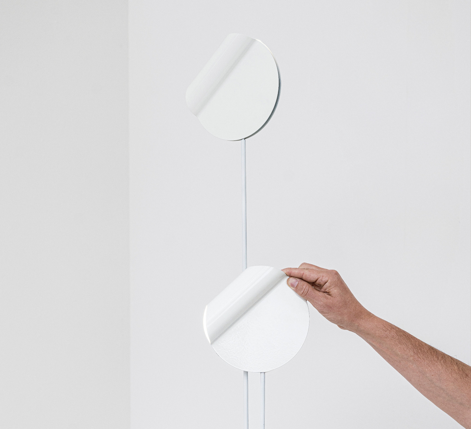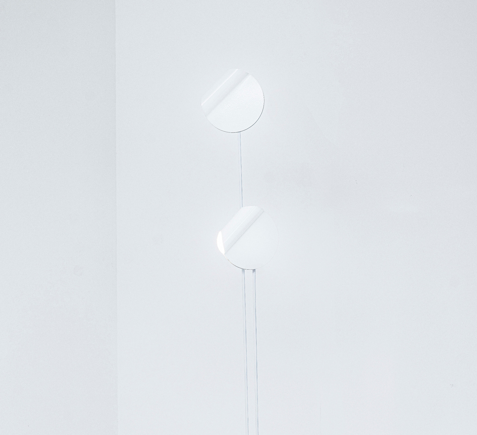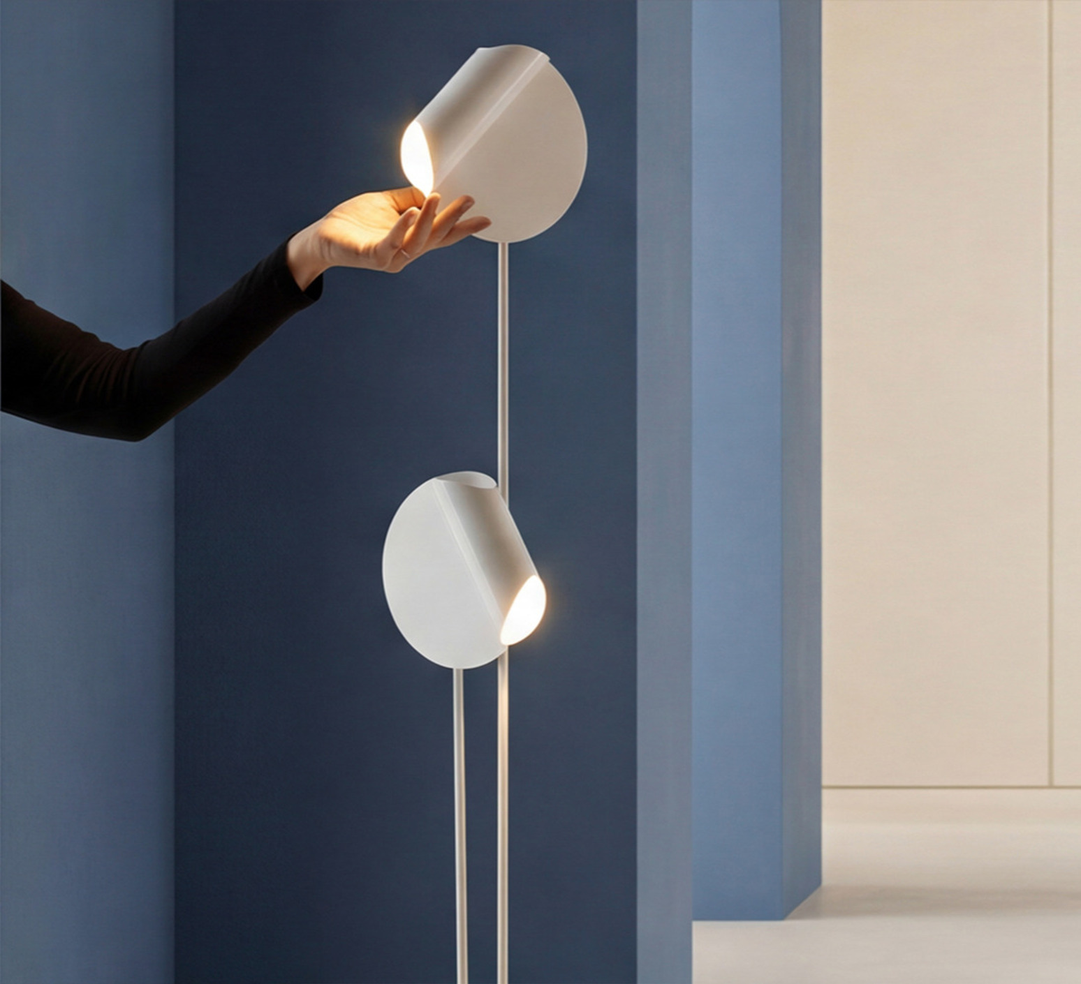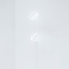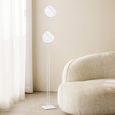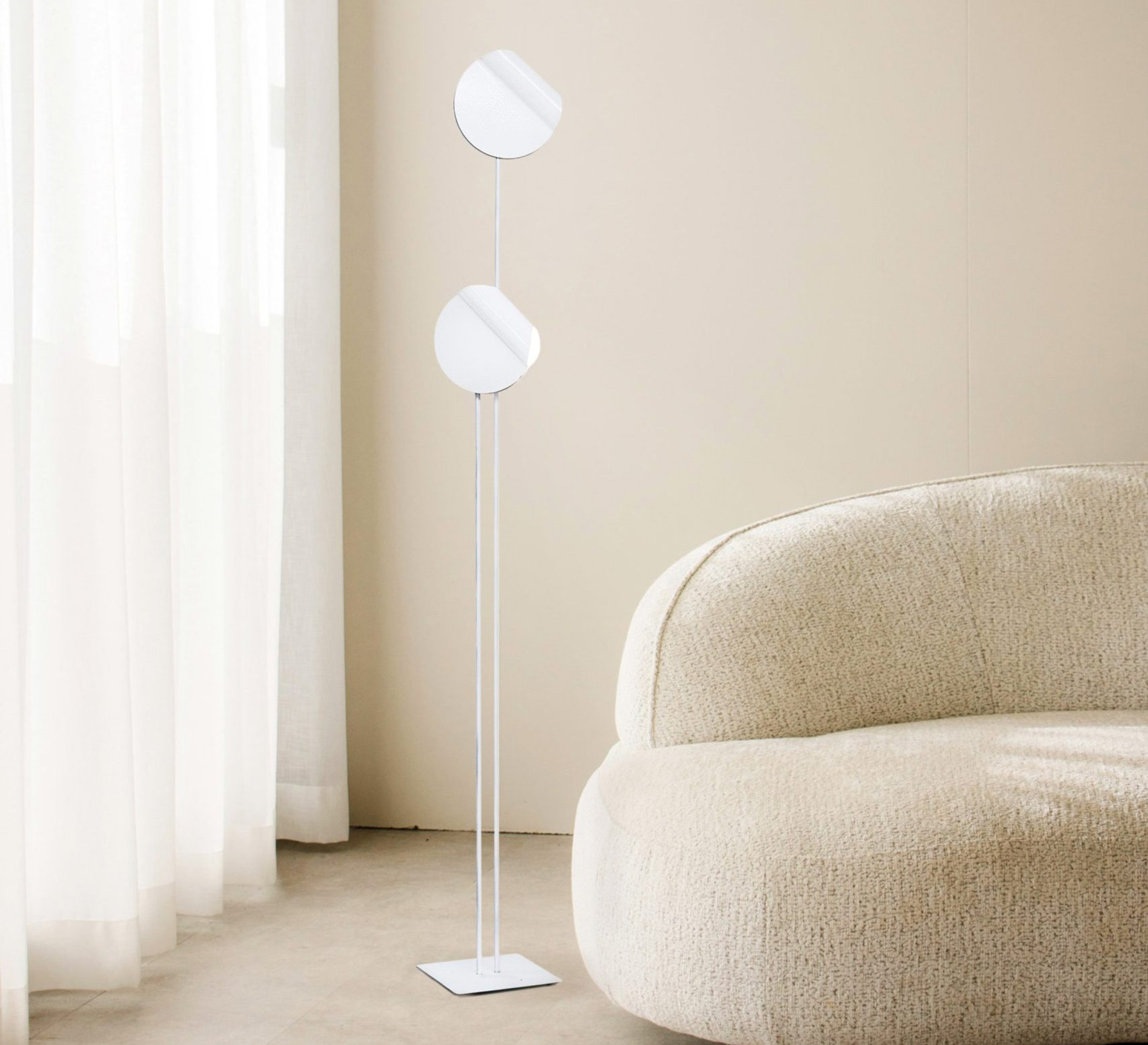 Its slender steel structure affirms the geometric purity of the collection. In a glossy white finish, with matte stem and glossy light heads, it creates a subtle contrast between structural rigor and luminous volume. Installed in a living room or reading corner, it punctuates the space with elegance while offering a controlled graphic presence.