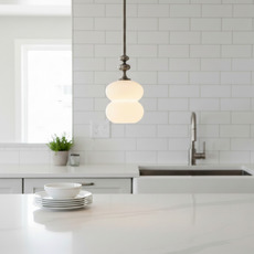 The Oestre suspension features curved lines and a cylindrical, double-elliptical shape in white blown glass. The antique brass finish elegantly extends the diffuser with a refined decorative profile, adding a subtle, warm presence. Ideal above a table, an island or in a multiple composition, it structures the space while diffusing a soft, sophisticated atmosphere.