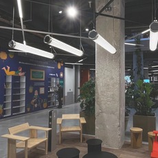 Available in silver or charcoal, this suspension luminaire illuminates 360 degrees and is ideal for large spaces.