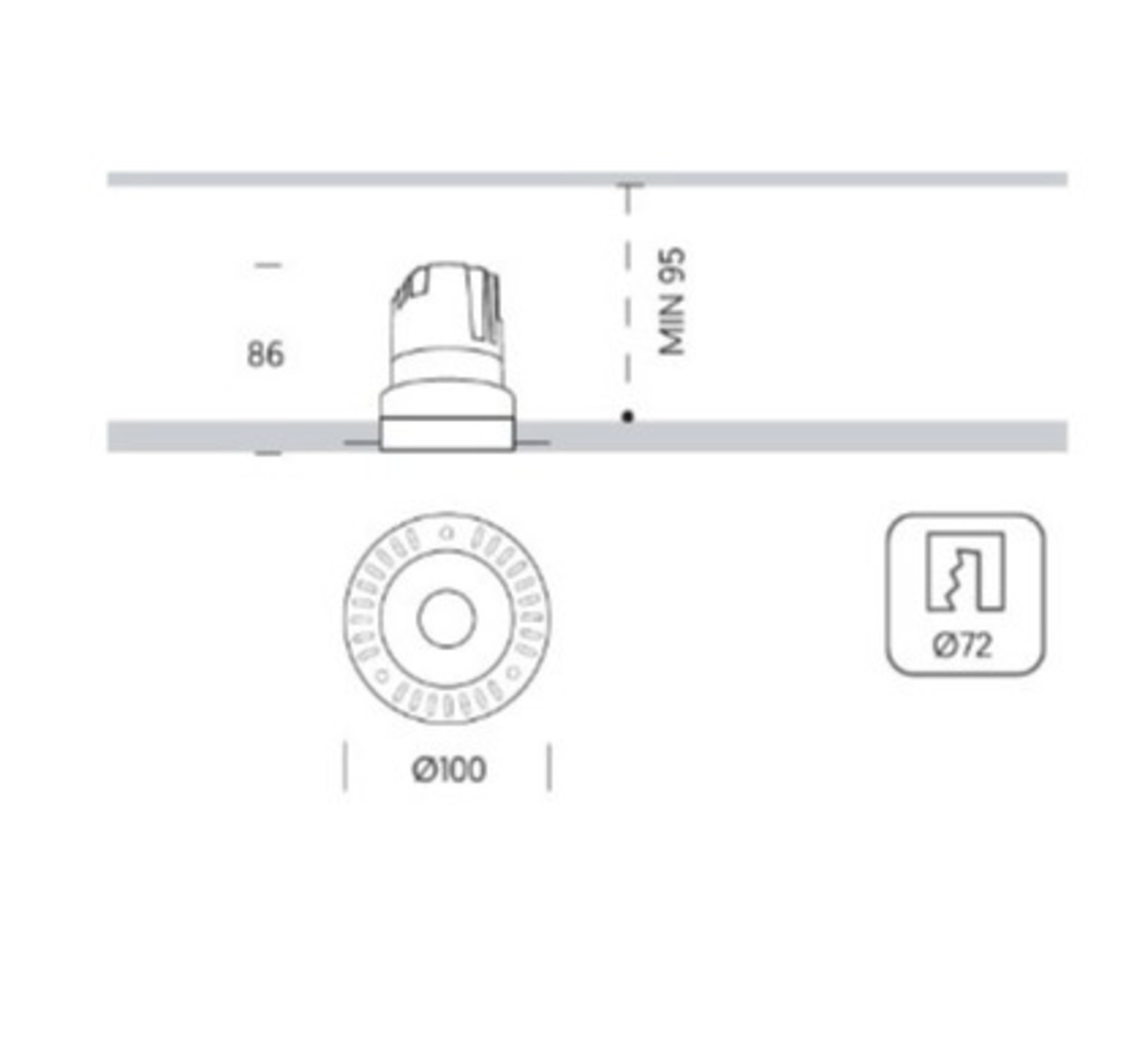 This recessed spot operates with an integrated LED source, with no visible cables. It provides direct lighting with an aperture angle of 36°, offering a warm light of 2700K and a luminous flux of 1182 lm. Lighting quality is high, with a CRI of over 90, guaranteeing excellent color rendering. Dimensions are Ø10 cm and H 8.6 cm, non-dimmable.