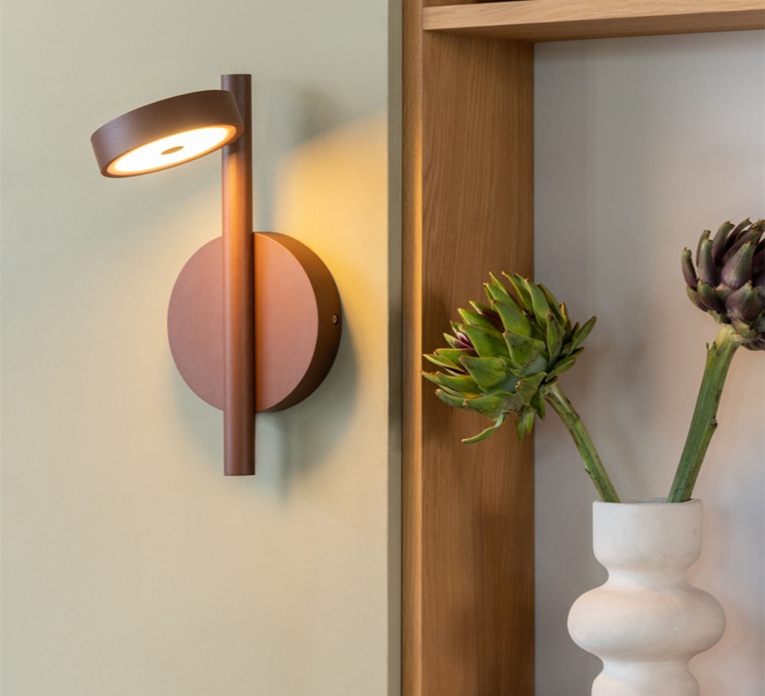 Made from brown ash, its cylindrical shape dresses the wall with elegance and sobriety. It's ideal for living rooms, bedheads or passageways, and combines easily with raw materials and warm palettes. Its balanced design radiates a soft, structuring decorative presence.