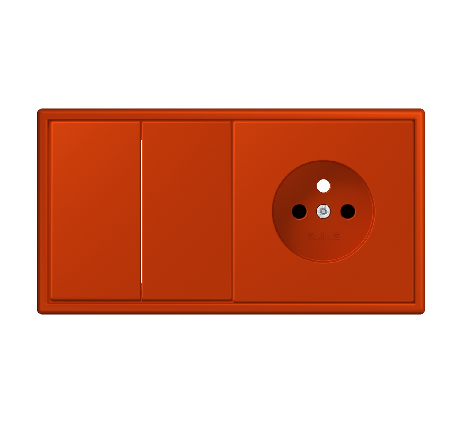 Interruptor y enchufe, LS 990, Doble horizontal, Le Corbusier Vermillon rojo 59 4320A, Interruptor de dos vías x2, Enchufe 2P+T x1, An15,2cm, Al8,1cm - Jung