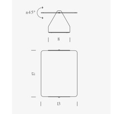 El modelo más pequeño mide 17 cm de largo, 13 cm de alto y 8 cm de profundidad. Disponible en varios colores. Requiere una bombilla regulable R7s de 80 W como máximo. Sólo se puede instalar en horizontal.