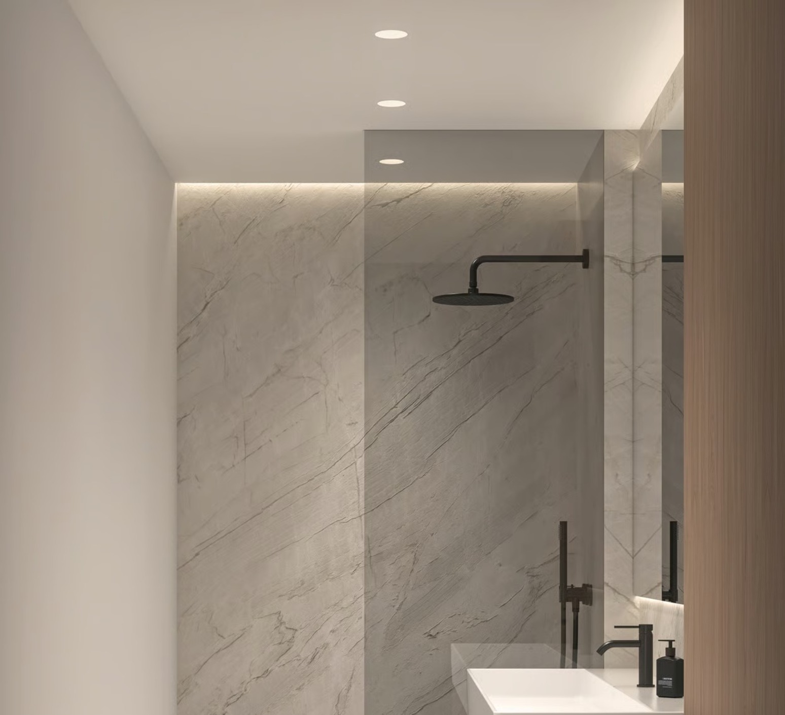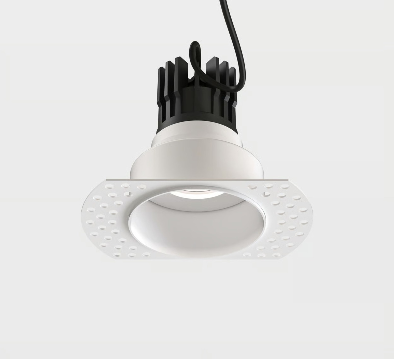 Su diseño trimless (sin borde visible) en acabado blanco mate se integra perfectamente en los techos modernos.