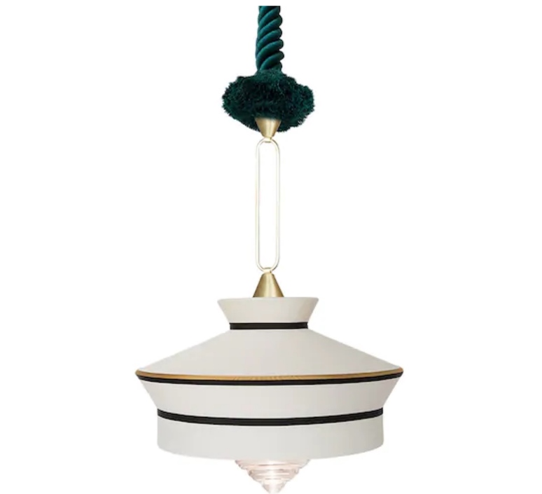 La suspensión Calypso Martinique, de color blanco cálido, adopta la forma de un insólito sombrero. Sus refinados acabados corren a cargo de un único artesano, que trabaja meticulosamente en la lámpara de principio a fin. Suspendida de una estructura de latón dorado, sujeta a su vez a un sedoso cordón de seda trenzada verde, la pantalla encanta con sus elegantes líneas geométricas.