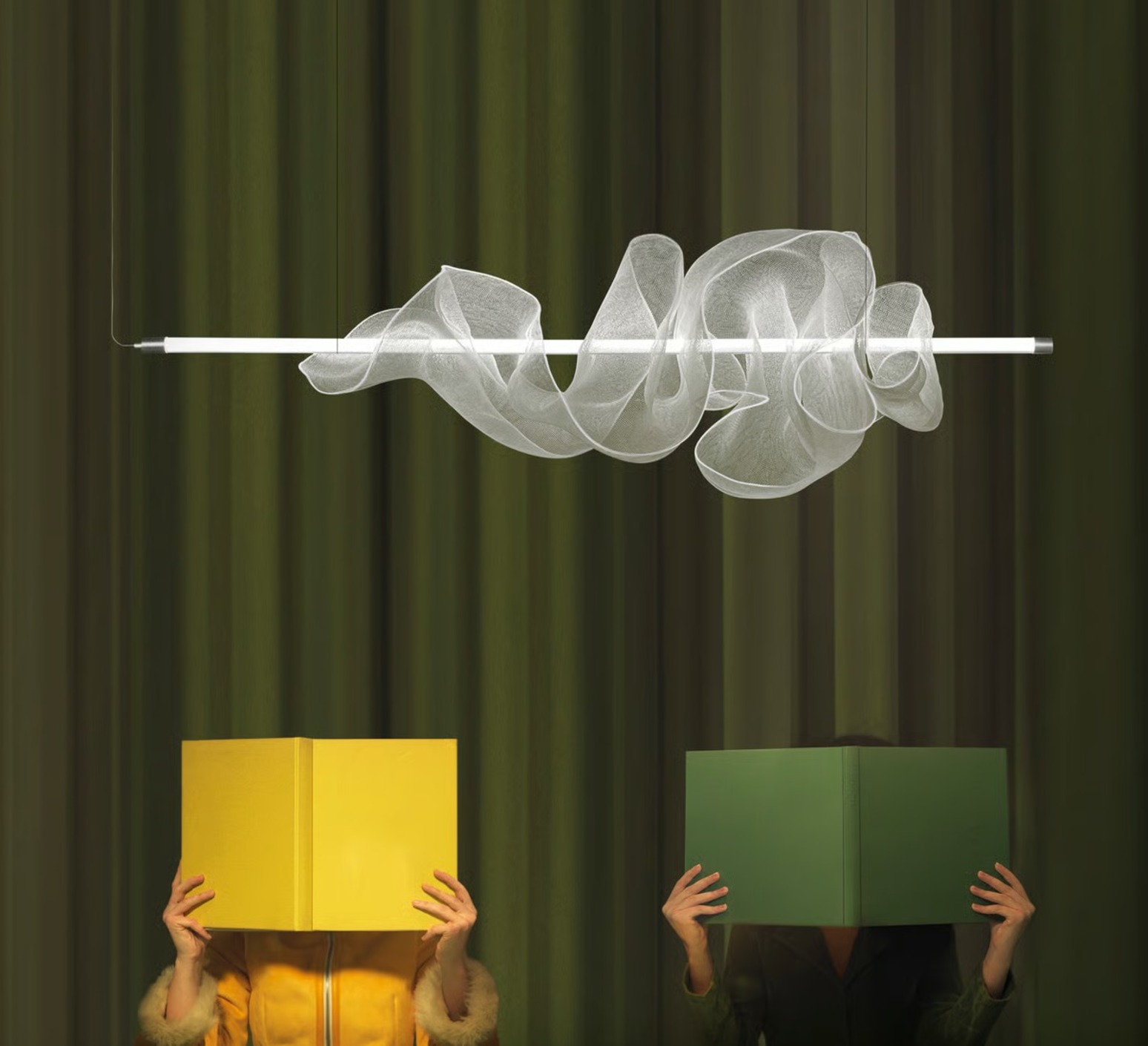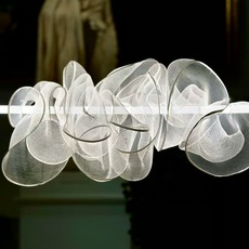 Totalmente realizada a mano con malla sintética translúcida y un difusor acrílico de 360º, devuelve la luz con suavidad y matices, transformando la luz en una atmósfera casi poética. Cada pieza es única y está numerada, lo que refleja el trabajo artesanal de la artista y su interpretación de la luz como un material en movimiento.