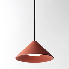 Fabricada a mano en Italia, esta lámpara colgante de hormigón coloreado presenta un sutil y cálido acabado en rojo oriental, ideal para añadir un elegante toque decorativo a un interior moderno.