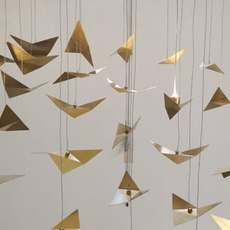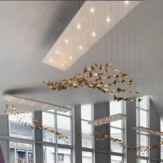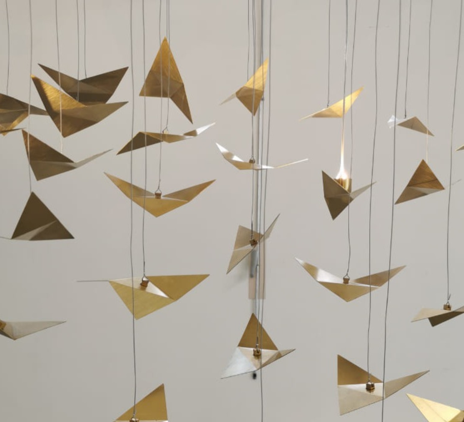 Consta de un gran rosetón rectangular de madera lacada que alberga las fuentes LED, y de unos 80 elementos de latón cepillado y encerado que representan pequeños pájaros en vuelo. Al encenderse, la luz emitida por los módulos LED se refleja en las piezas de latón, creando un efecto cautivador y envolvente que estructura el espacio a la vez que cuenta una historia visual.