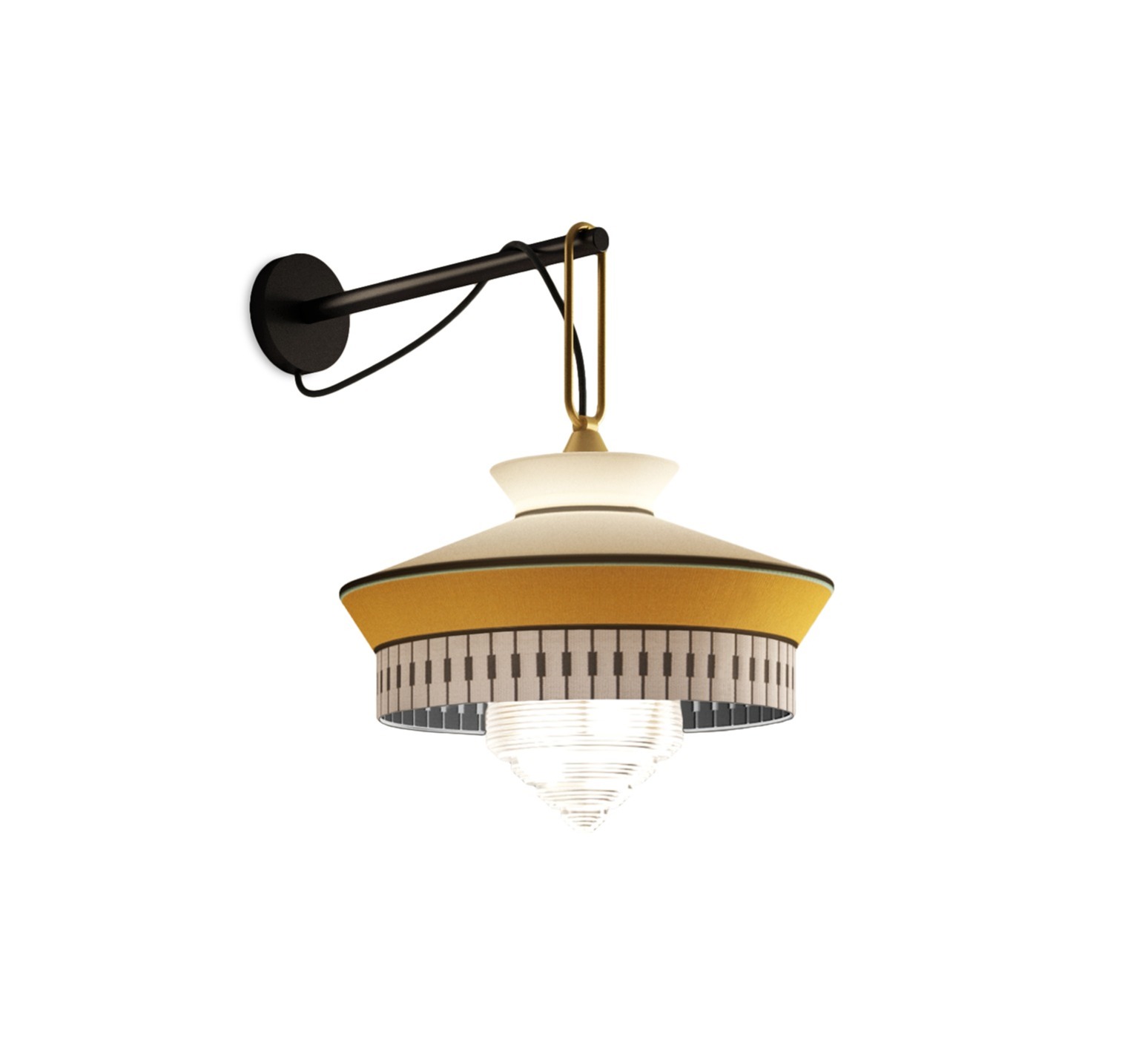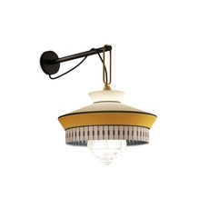 L'applique murale Calypso Martinique de Contardi, dessinée par le studio italien Servomuto, puise son inspiration dans l'esthétique de l'Art Déco des années 1920, mêlant des tissus texturés aux motifs géométriques rigoureux avec des couleurs vives inspirées de la culture sud-américaine et tropicale.