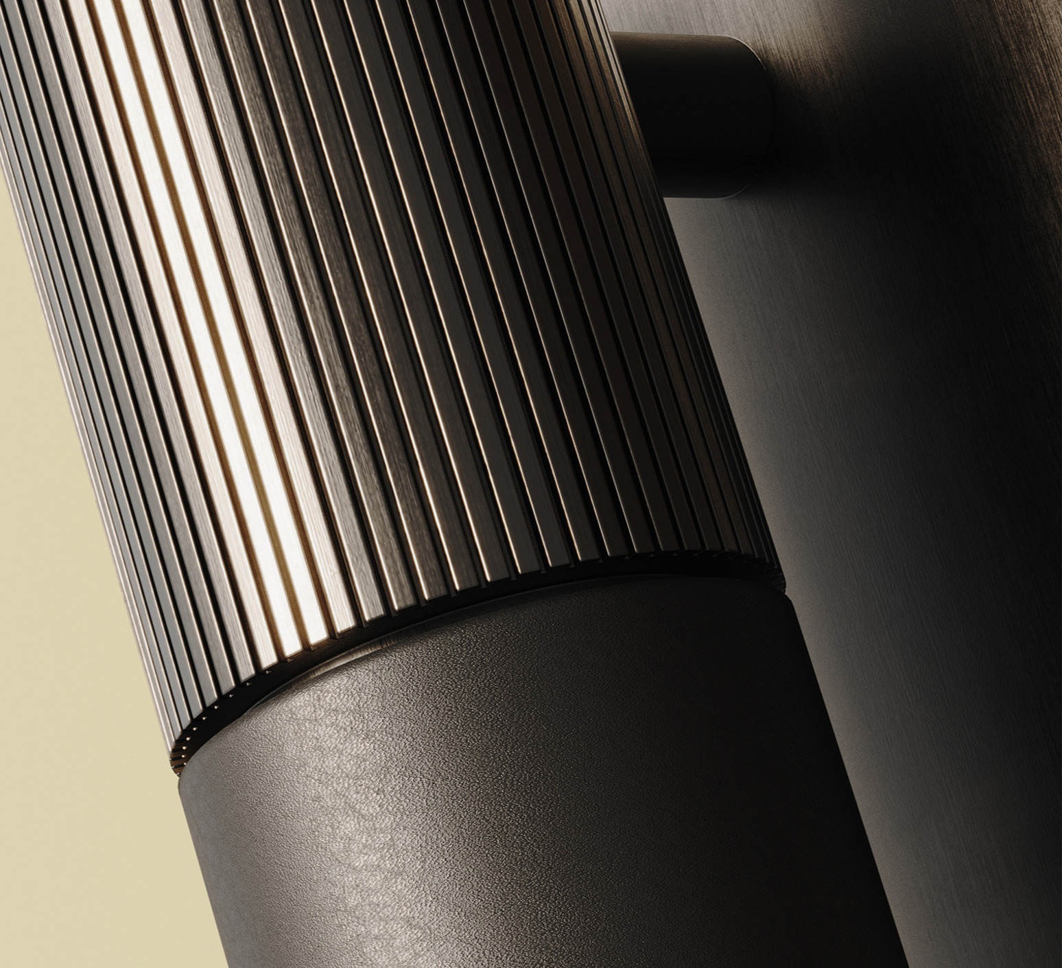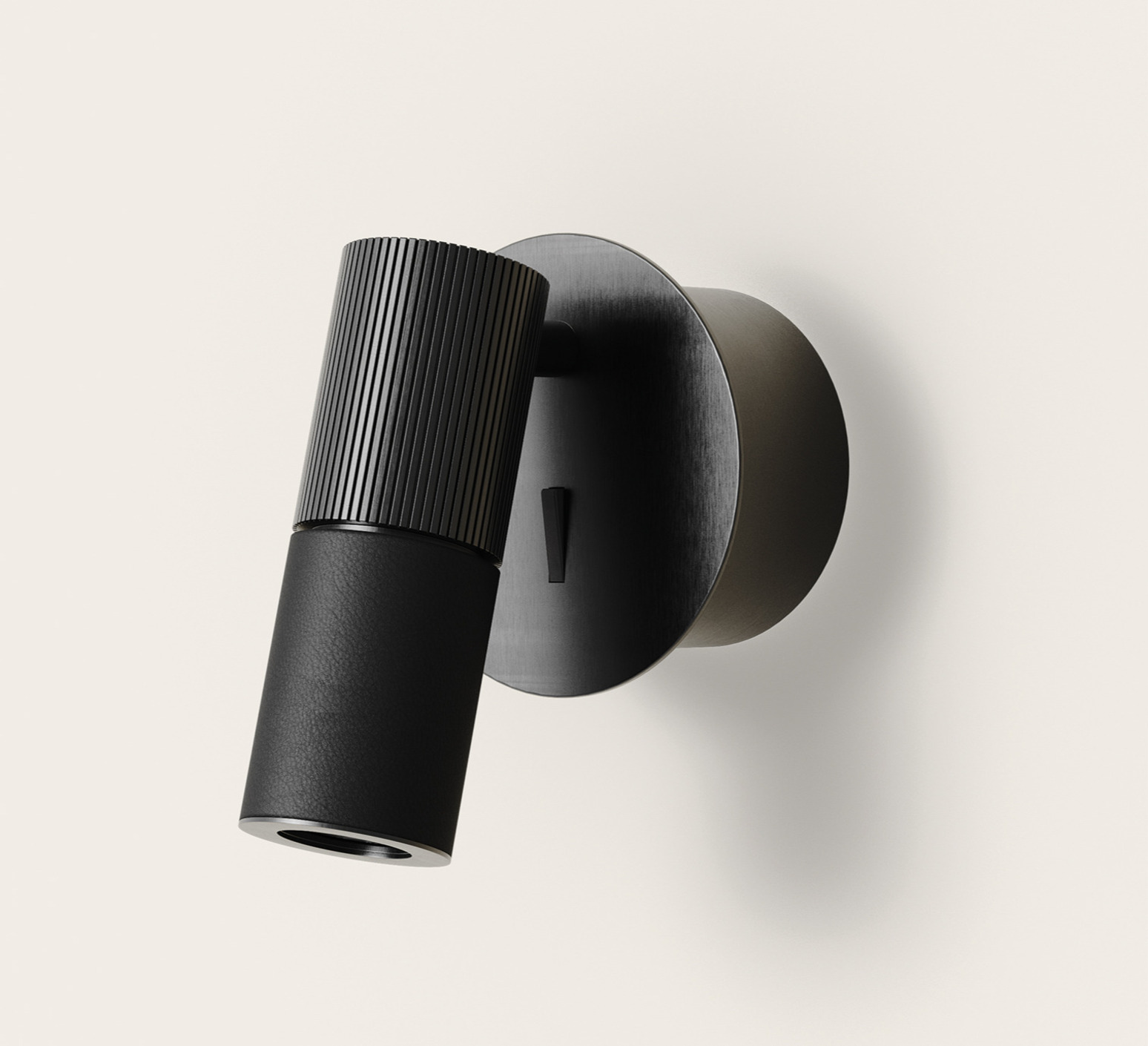 L’applique Tura affiche une silhouette cylindrique au caractère résolument contemporain. Son diffuseur orientable, mêlant cuir noir et métal noir mat, apporte une touche chaleureuse et sophistiquée tout en conservant une ligne graphique et maîtrisée. Installée en tête de lit ou dans un coin lecture, elle structure l’espace avec élégance tout en offrant un éclairage fonctionnel parfaitement ciblé.