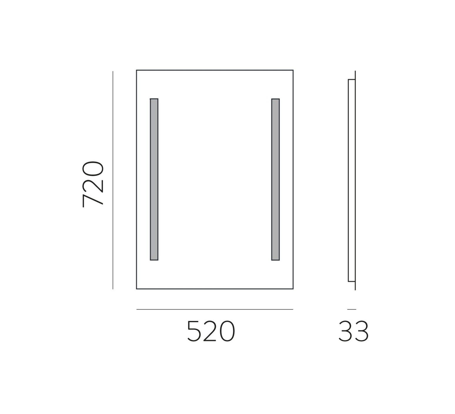 Jour intègre deux sources LED de 9 W chacune, produisant un flux lumineux d’environ 1618 lumens avec un excellent indice de rendu des couleurs (CRI > 90) pour une lumière douce et agréable. La température de couleur est de 3000 K (blanc chaud). Il mesure 72 cm de hauteur, 52 cm de largeur et 3,3 cm de profondeur. Le miroir n’est pas dimmable, et la source LED est intégrée de manière fixe.