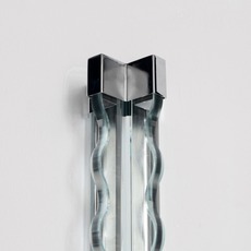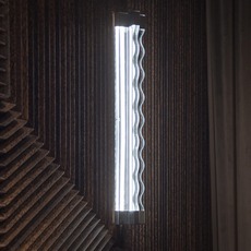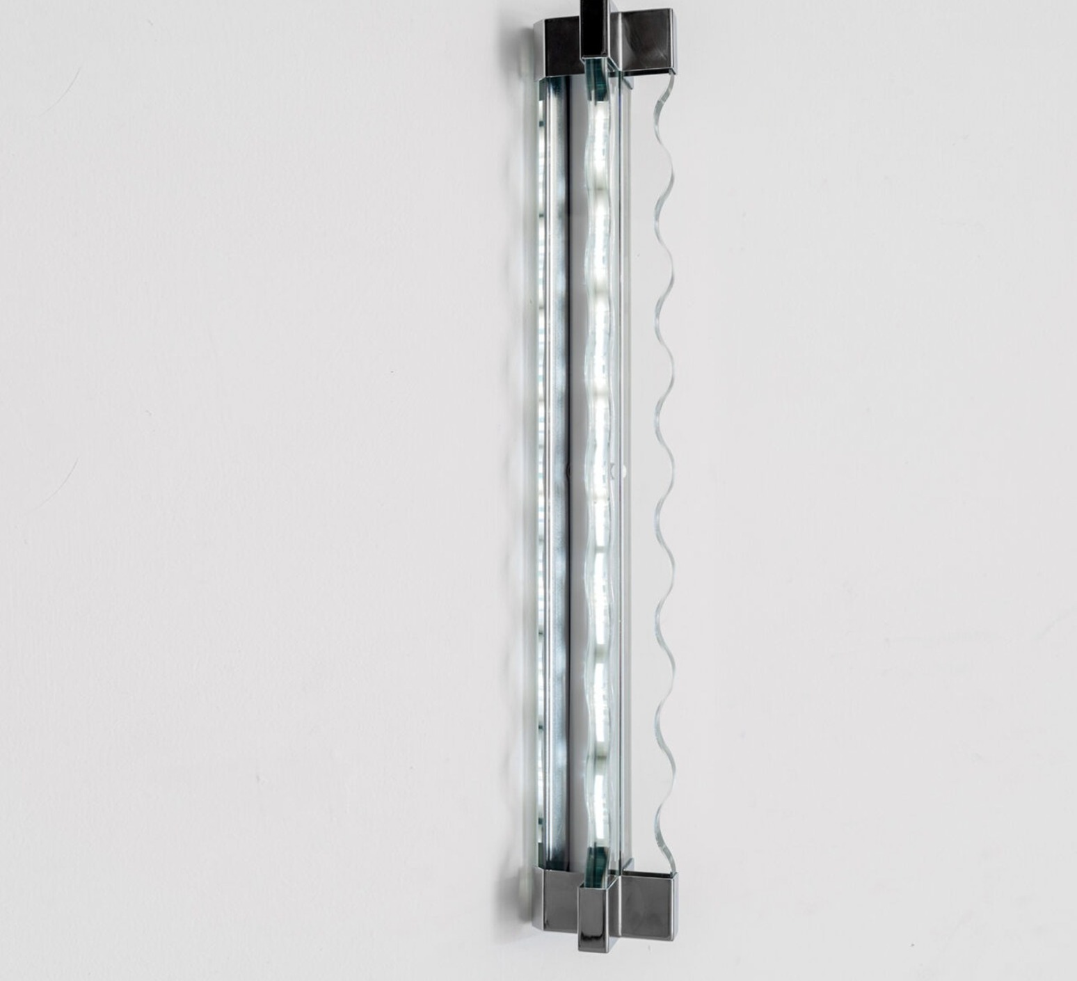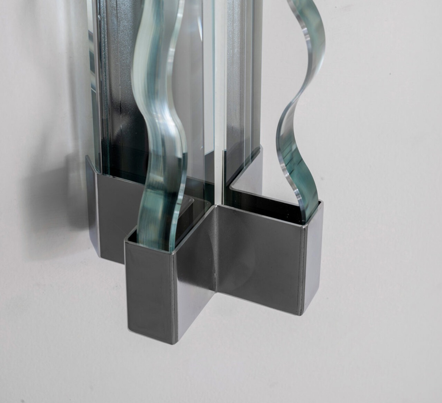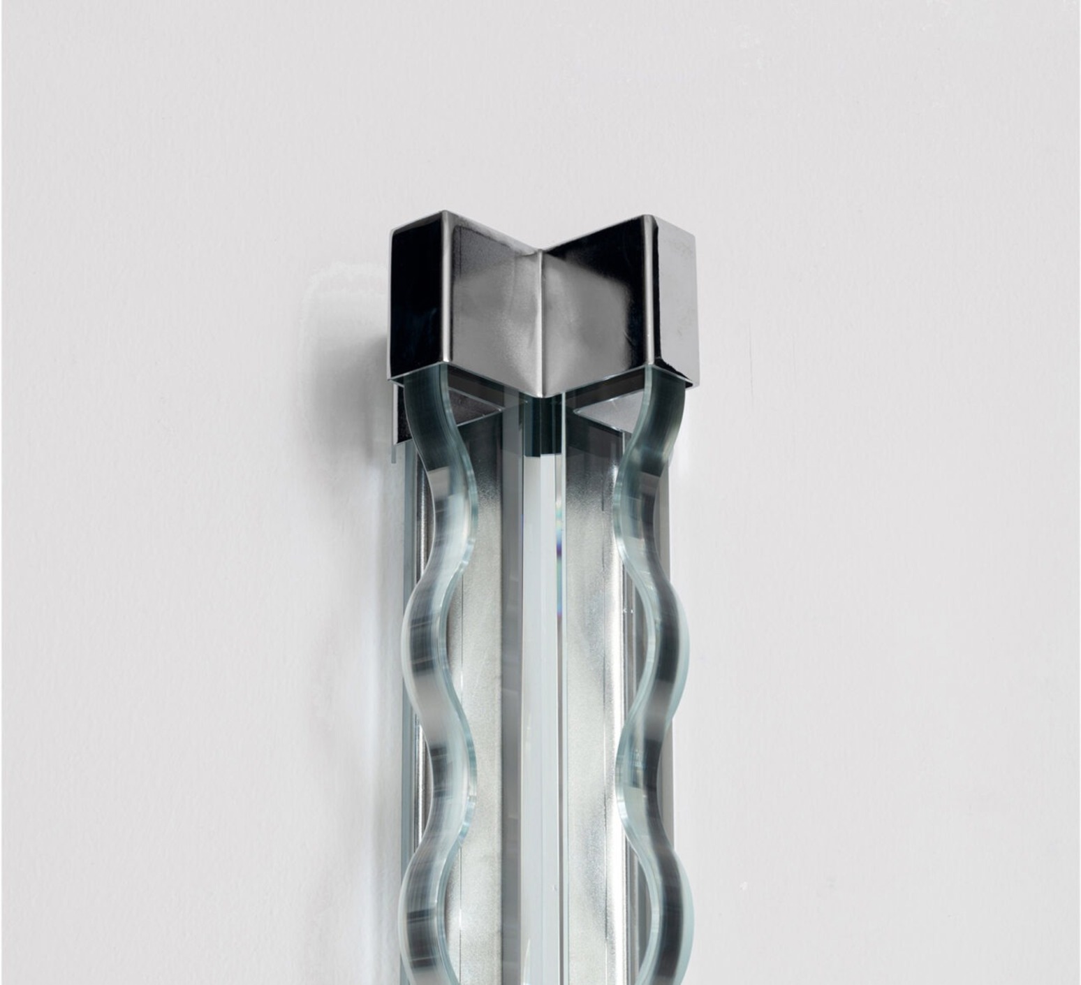 Cette lampe murale combine verre extra-clair épais soigneusement coupé et poli à une structure métallique chromée, offrant une silhouette élégante où la lumière se propage avec douceur à travers la matière cristalline du diffuseur. Le nom Frenesi est inspiré de l’idée d’une vague sensuelle qui se reflète dans la forme et la texture lumineuse du luminaire.