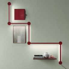 Cette configuration murale en forme d'escalier joue sur une composition longiligne de lignes droites et de points de jonction. La finition rouge terre apporte une présence graphique affirmée, idéale pour souligner un mur d'escalier, un palier ou un volume en double hauteur. Les modules linéaires et les éléments circulaires créent un rythme visuel précis, transformant le mur en surface lumineuse active sans recours à un décor supplémentaire.