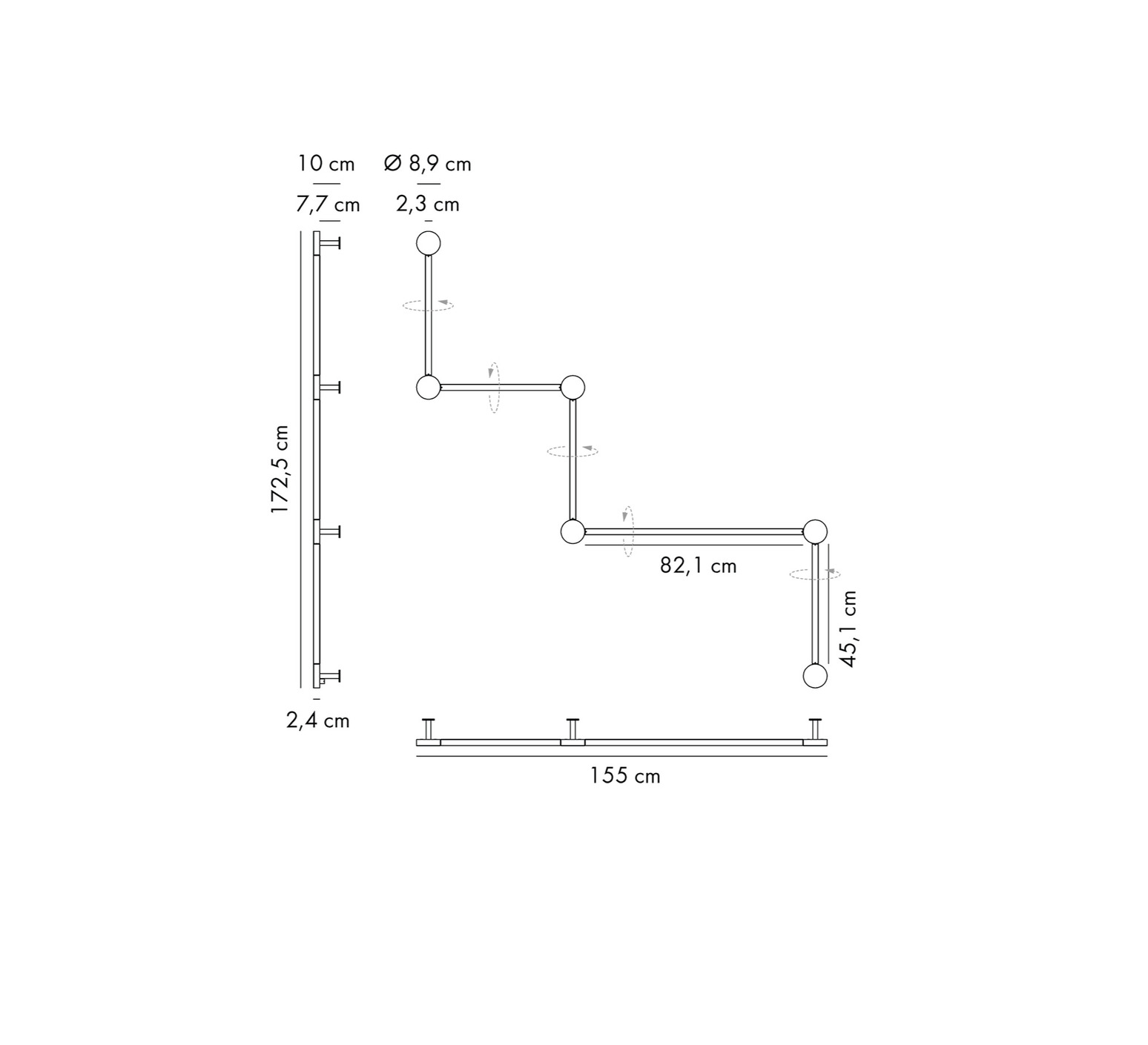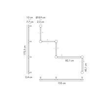 L'applique intègre une source LED incluse de 2700K, offrant un flux lumineux de 4471 lumens, avec un éclairage direct et indirect et un IRC supérieur à 90. Réalisée en aluminium, elle mesure 155 cm de longueur pour 172,5 cm de hauteur. Les modules sont orientables jusqu'à 359° pour ajuster la diffusion lumineuse.