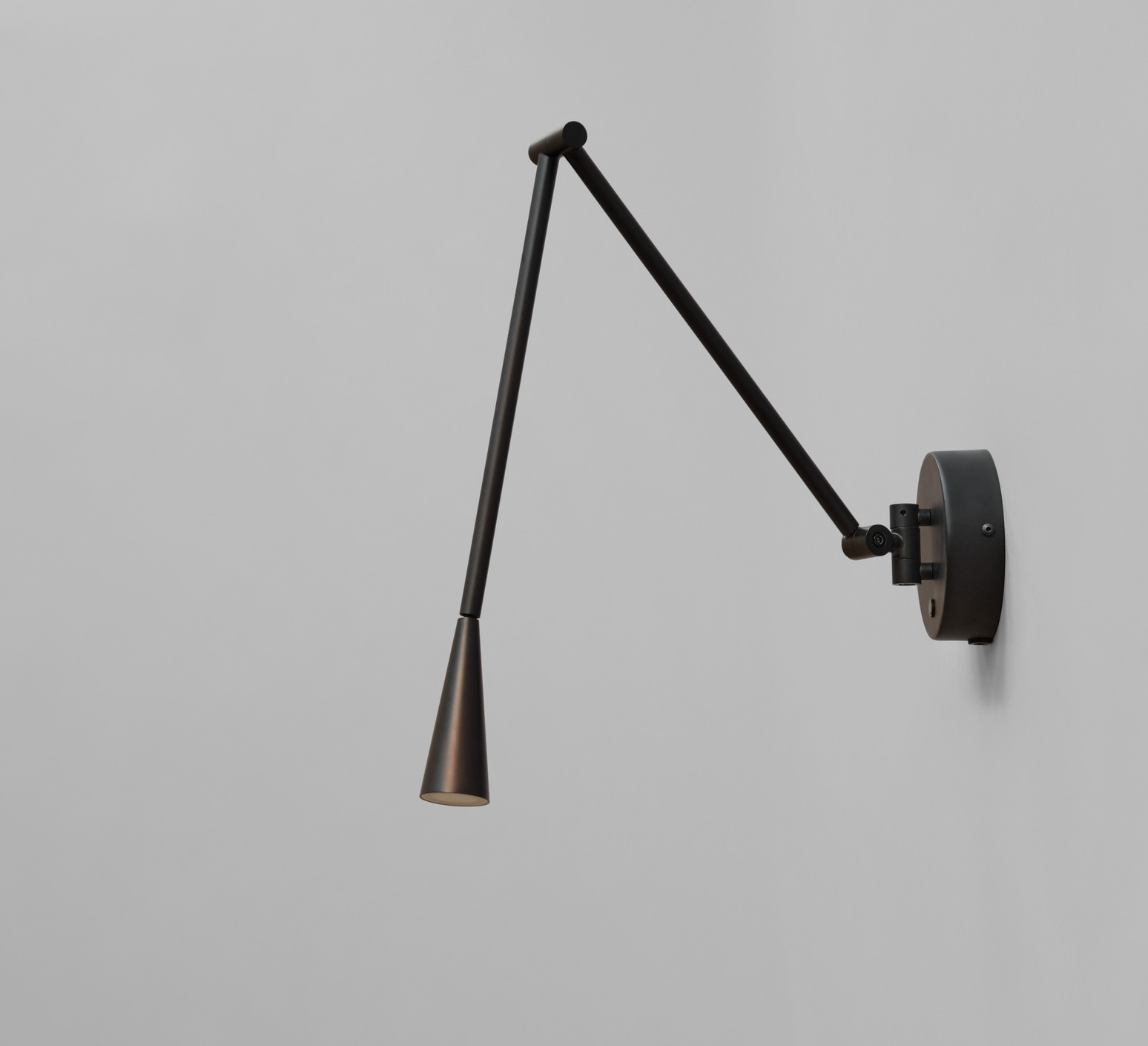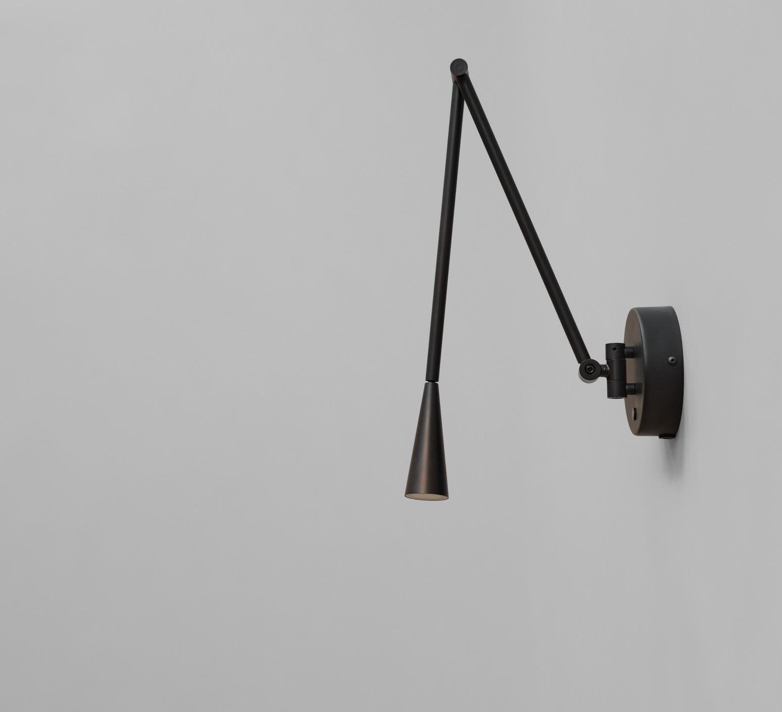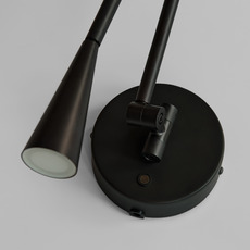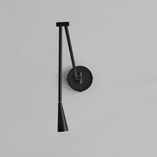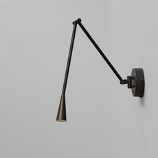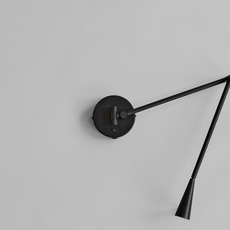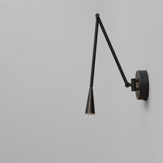 La lampe présente une finition noir brûlé sur sa structure en aluminium, avec des tubes élancés qui se courbent pour guider la lumière vers l’abat-jour conique. Cette forme conique diffuse une lueur chaude et directe, créant un contraste subtil entre la matière froide du métal et la lumière accueillante. Snake s’installe en accent mural, seul ou en série, pour rythmer un couloir ou compléter un espace de vie contemporain.
