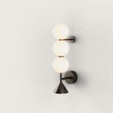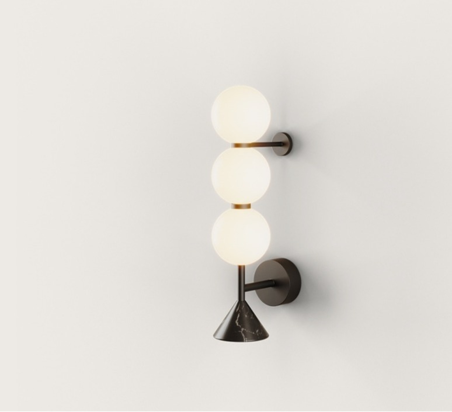 Cette applique murale associe trois sphères en verre opalin suspendues d’une structure en acier, sublimée par un élément en marbre.