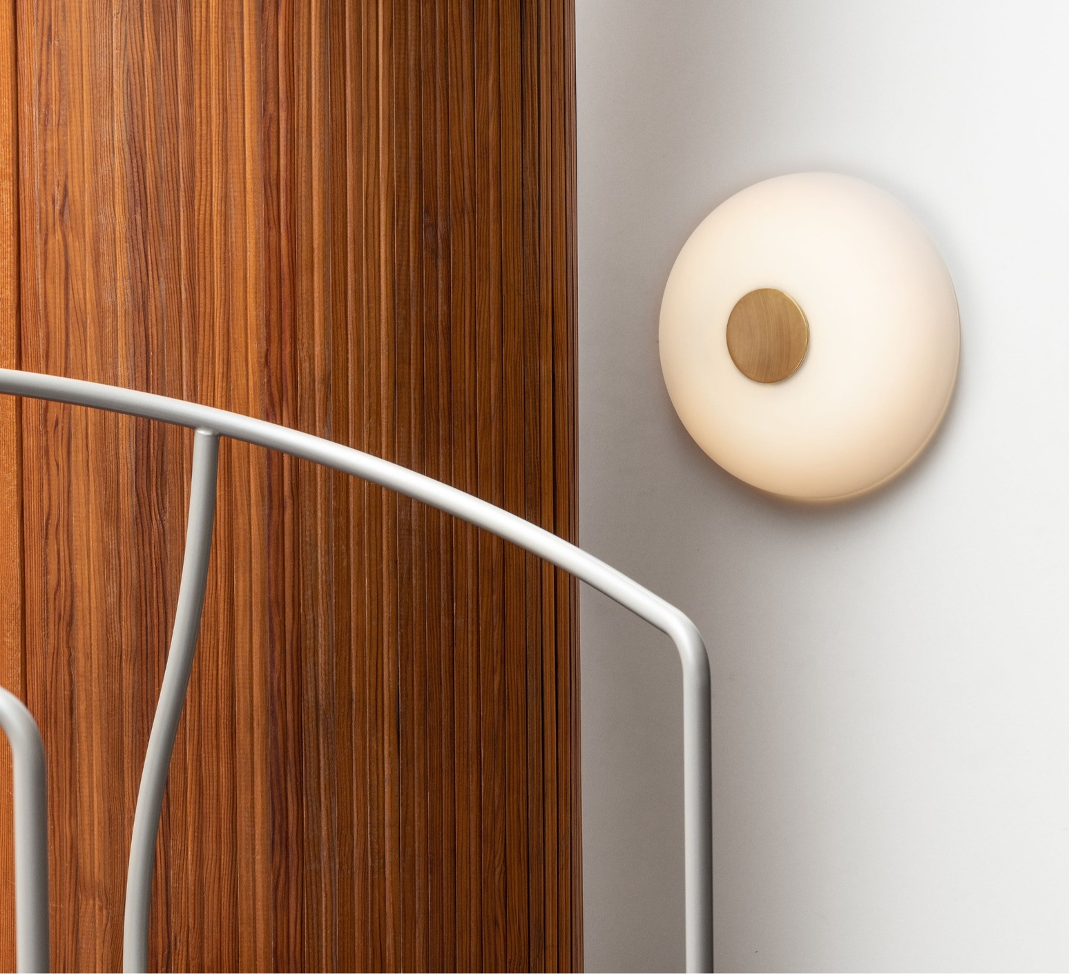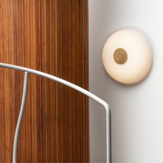 Tropico est une calotte sphérique en verre opalin opaque, aplatie et fixée par un grand bossage en métal miroir. La famille comprend des versions mur/plafond et table, toutes deux disponibles en trois tailles différentes.
