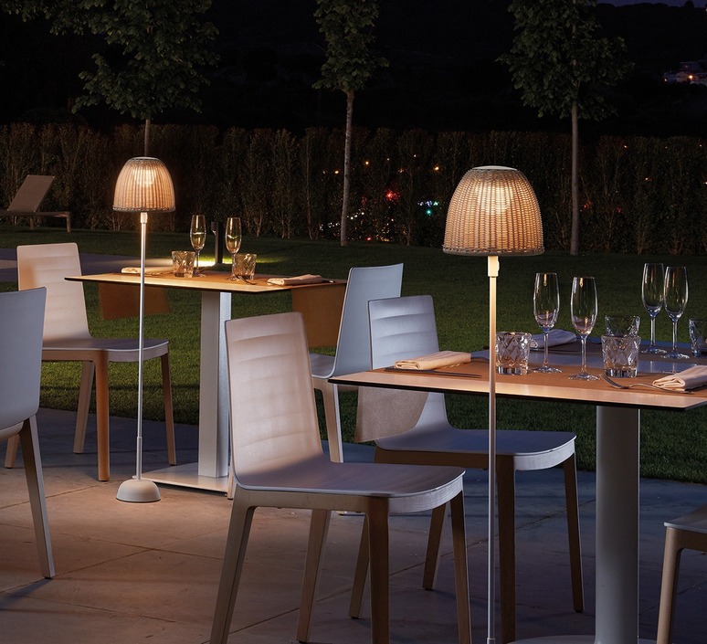 La lampe Atticus de Bover se veut légère et élégante, pensée pour créer une ambiance chaleureuse dans les jardins ou espaces extérieurs.